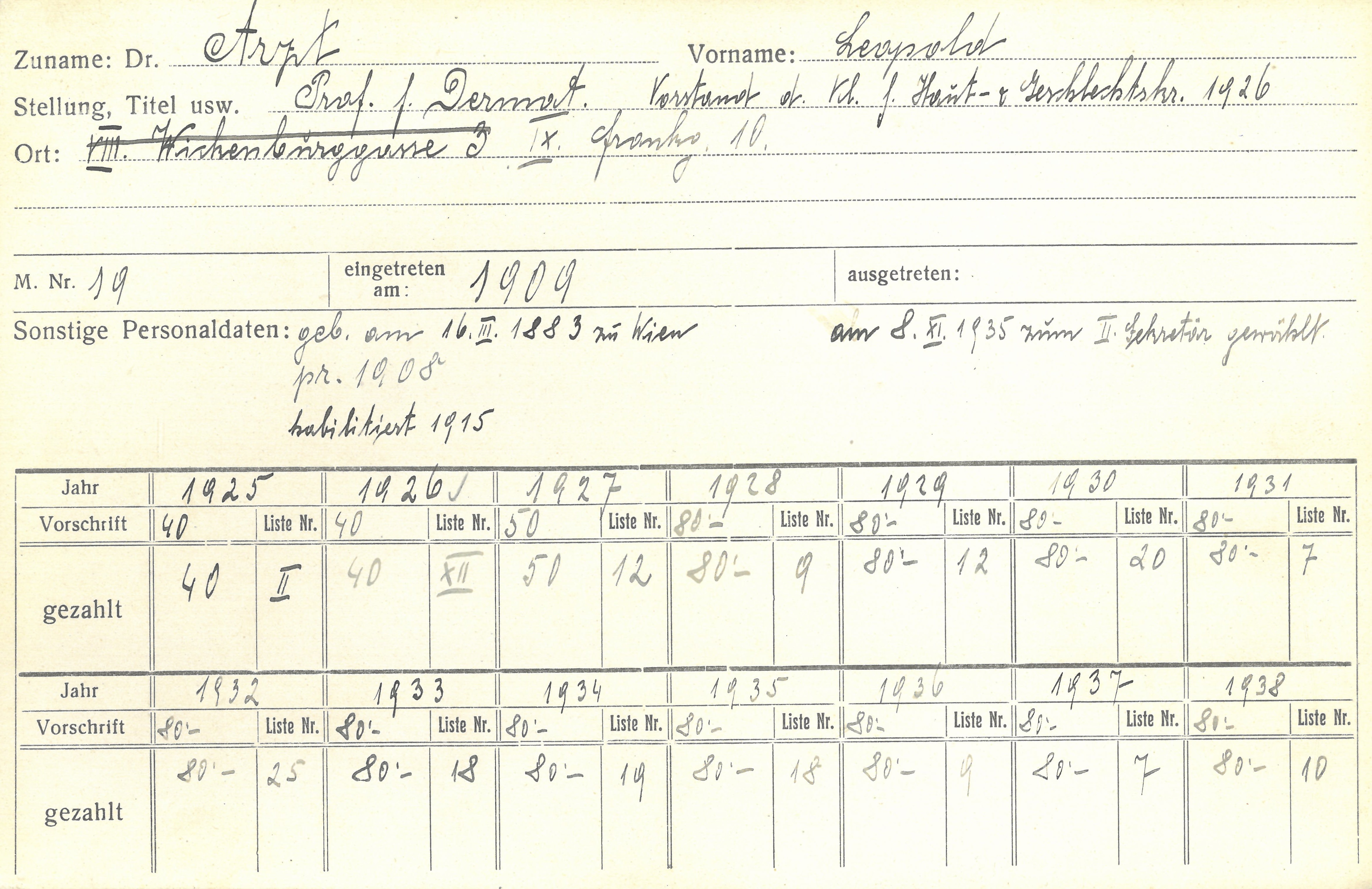 Professor für Dermatologie, Vorstand der Klinik für Haut und Geschlechtskrankheiten (1926), am 8. 11. 1935 zum II. Sekretär der Gesellschaft der Ärzte gewählt |