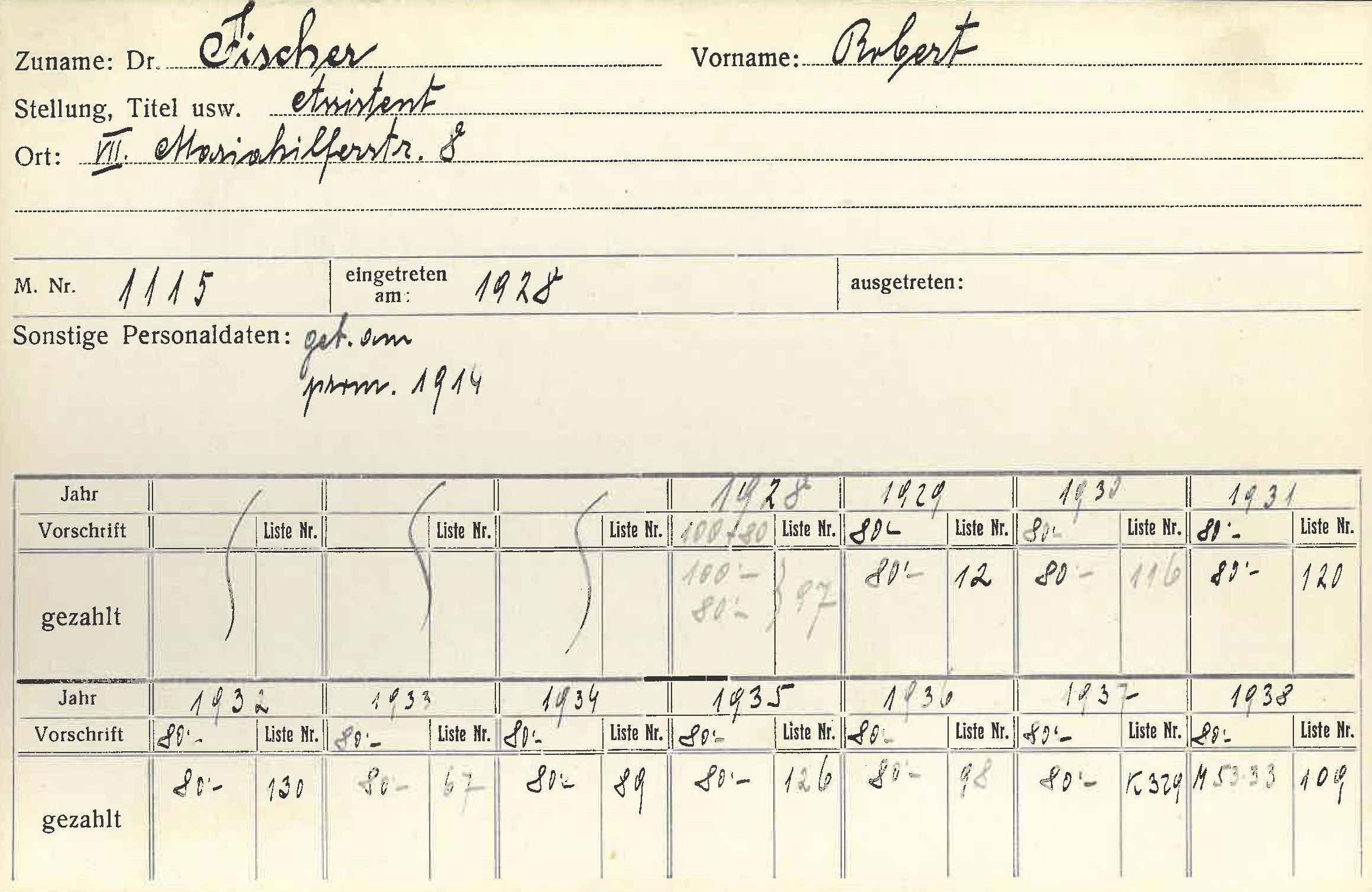 Fischer hielt folgenden Vortrag in der Gesellschaft der Ärzte in Wien: Schaukelbewegung der Brustwand bei Concretio cordis (31. 10. 1930).