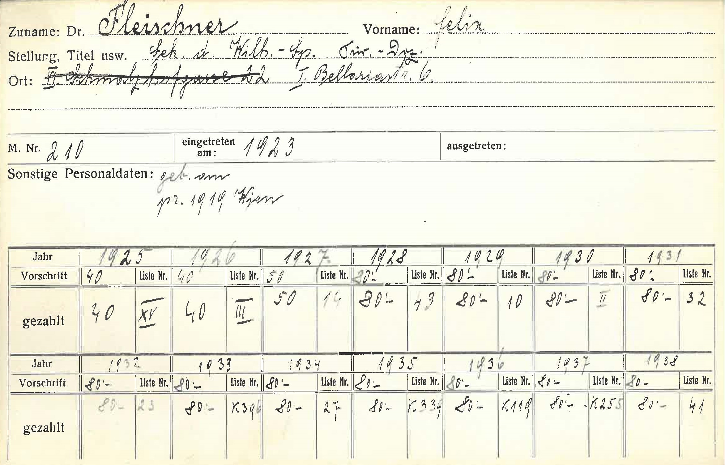 Felix Fleischner hatte nach seiner Promotion 1919 im Wilhelminenspital in