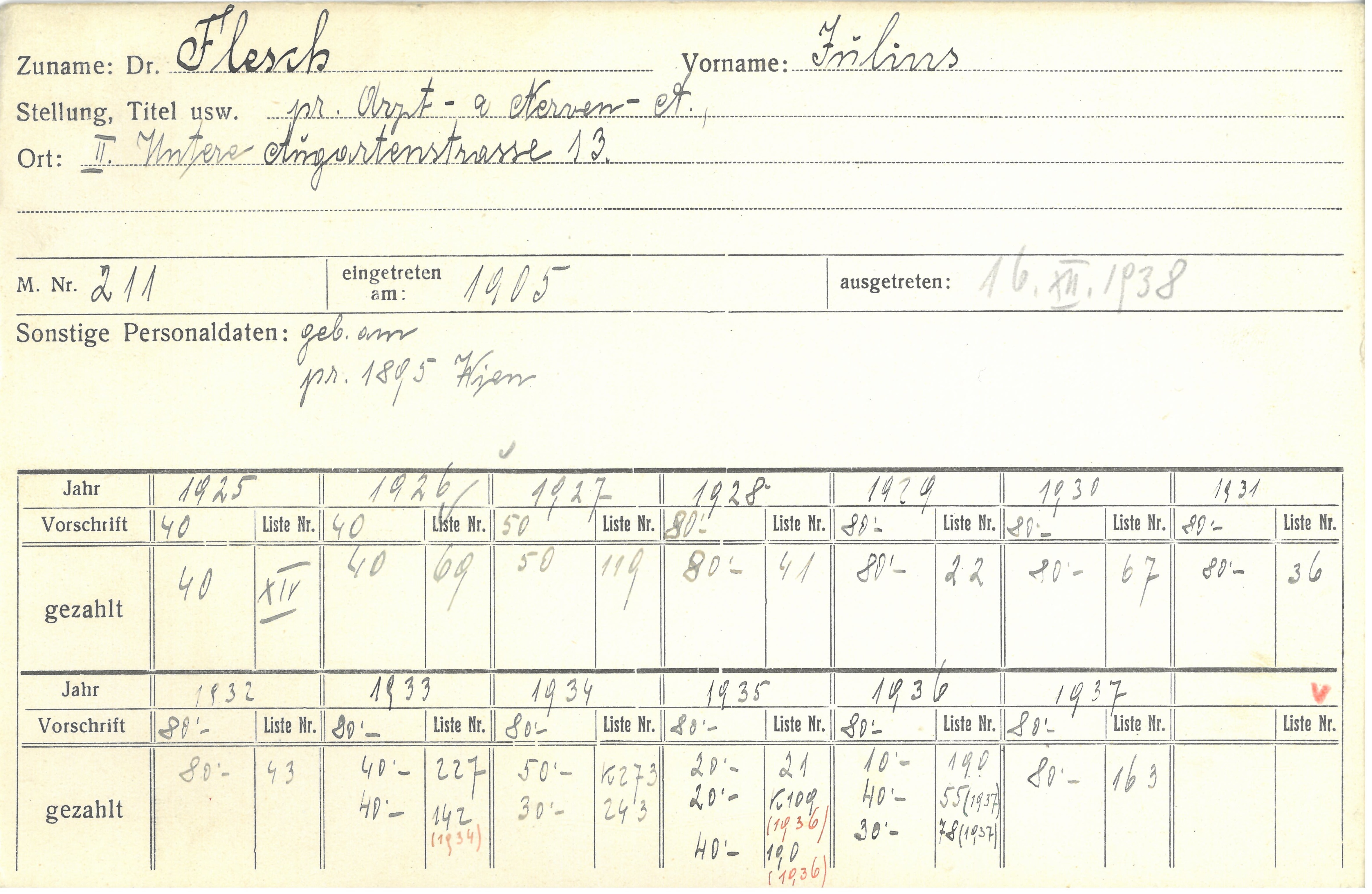 Flesch hielt folgende Vorträge in der Gesellschaft der Ärzte in Wien: Über Behandlung der Trigeminusneuralgie mit Alkoholinjektionen (21.5.1909 und 24.10.1913), Megalophthalmus (21.11.1913), Zwei neue Symptome bei usurierendem Aneurysma der absteigenden Aorta - Fernschmerz, federnde Rippe (29.4.1932) und ein weiteres Aneurysma ( 17.6.1932), Über Ernährung bei Bewußtlosen oder schwer Benommenen ohne Magenschlauch (16.5.1924), Karotiskompression zur Diagnostik der genuinen