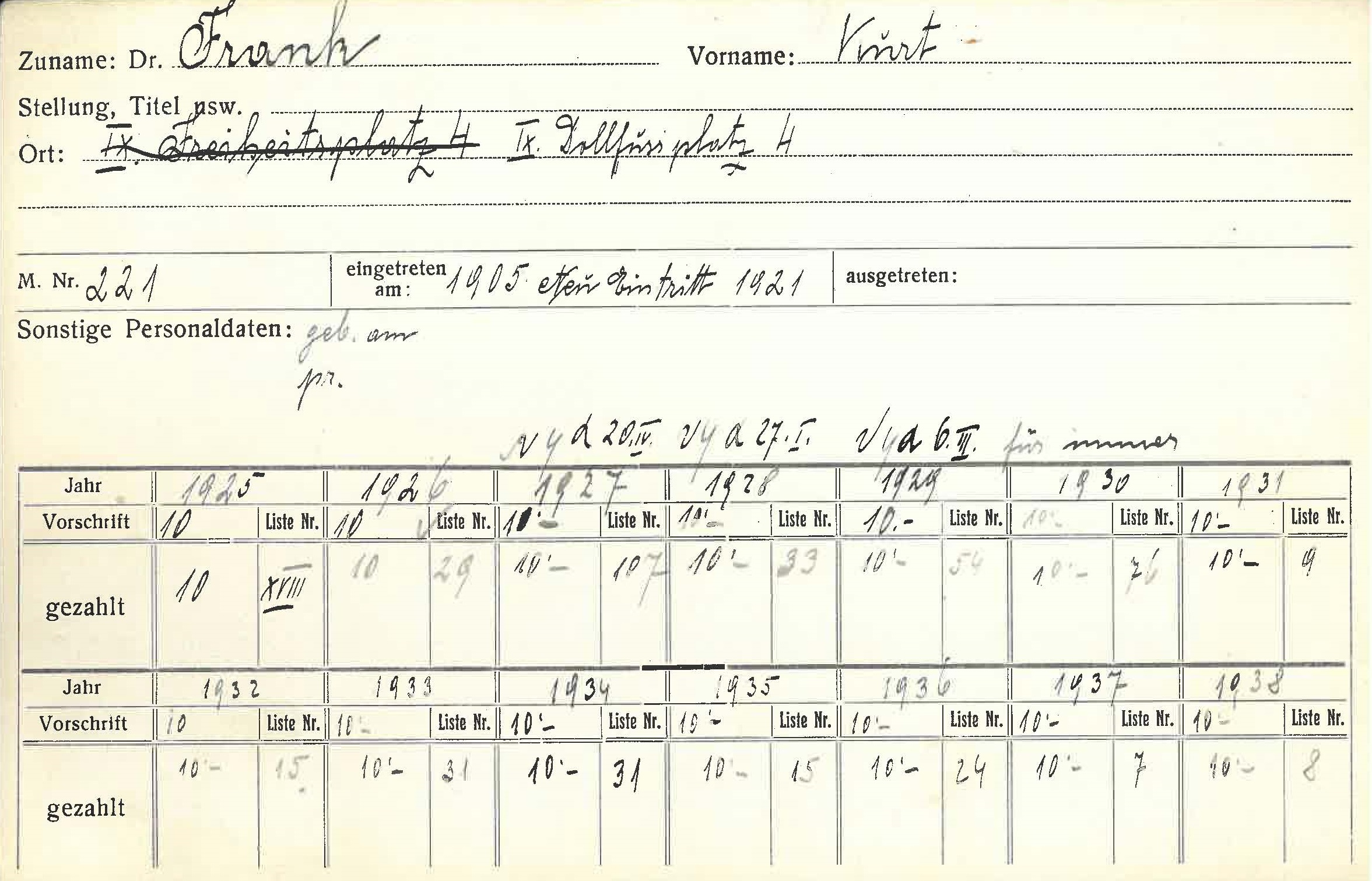 Für Kurt Frank übermittelt uns Isidor Fischer keine Vorträge in der Gesellschaft der Ärzte in Wien.