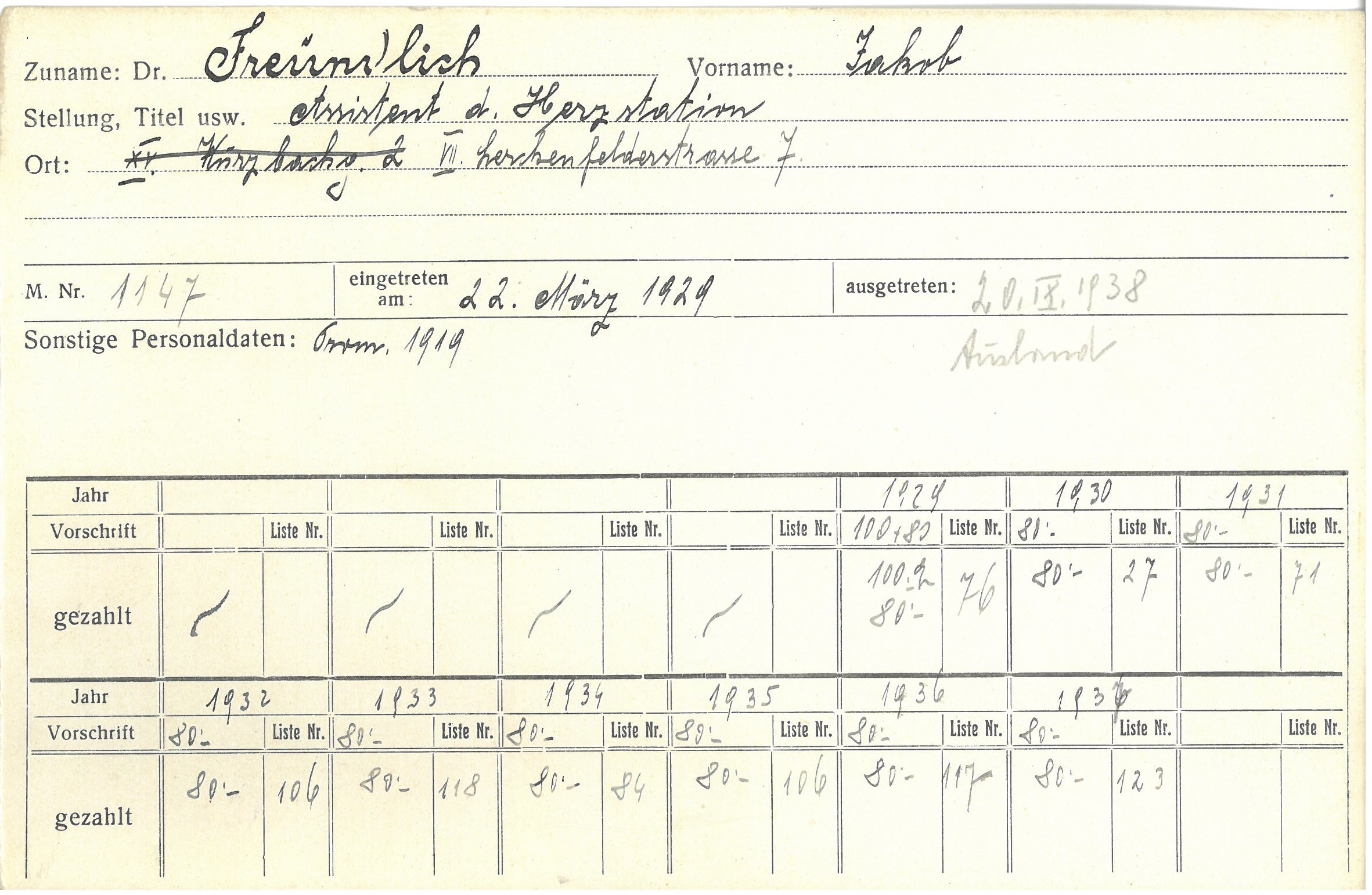 Jakob Freundlich hielt folgende Vorträge in der Gesellschaft der Ärzte in Wien: Intraperitoneale Salyrganinjektionen bei Herzkranken (30.10.1931).