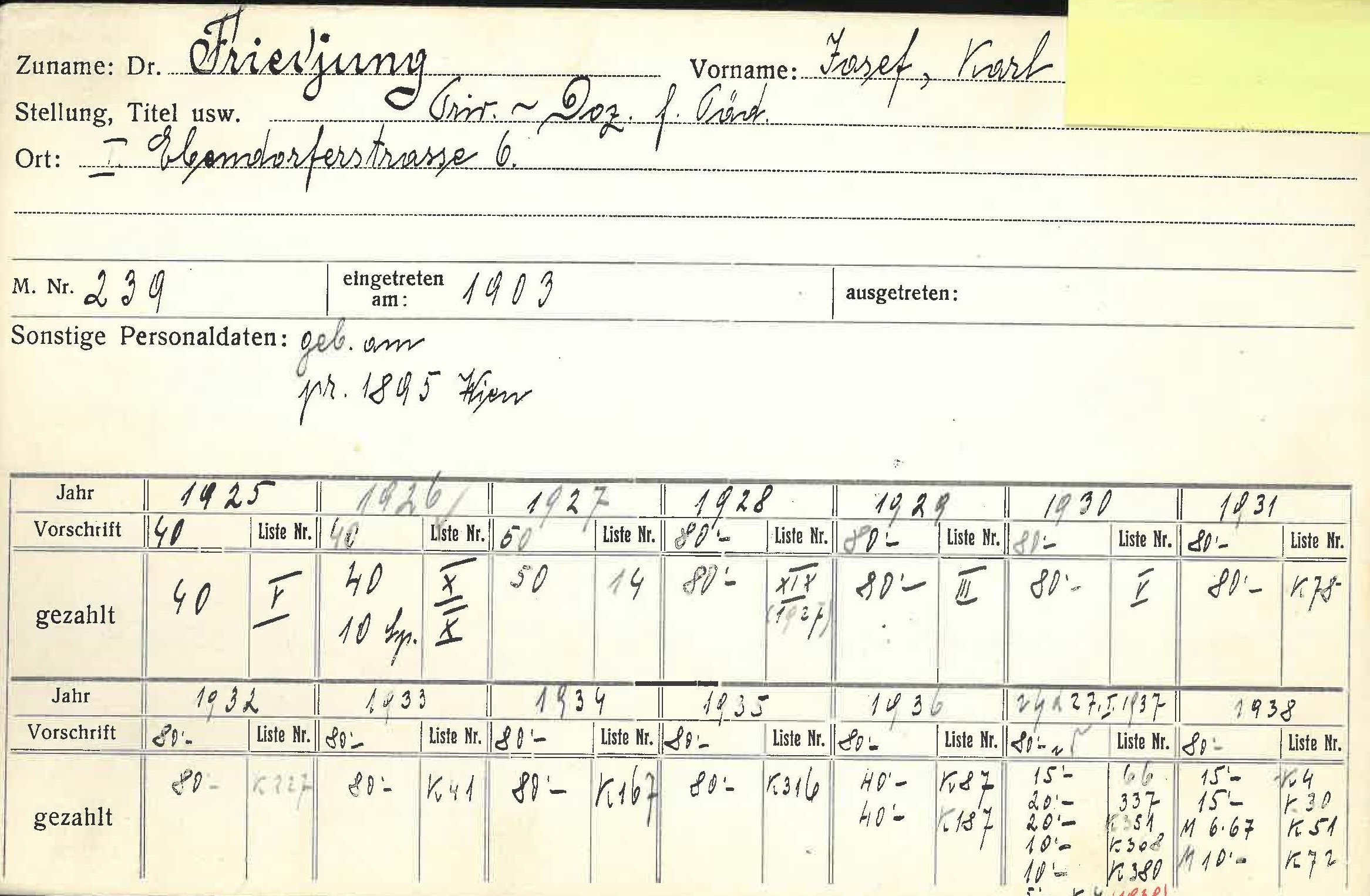 Eine Auseinandersetzung innerhalb der Gesellschaft der Ärzte wurde 1934 zum Ausgangspunkt eines sehr prominenten Falles der Verfolgung politischer Gegner durch die Dollfuß-Schuschnigg-Diktatur, die politisch motivierte Aberkennung der Venia legendi des sozialdemokratischen Kinderarztes Josef Karl Friedjung (1871-1946). Der Aberkennung war ein Konflikt zwischen Friedjung und dem Präsidium der Gesellschaft der Ärzte vorausgegangen.