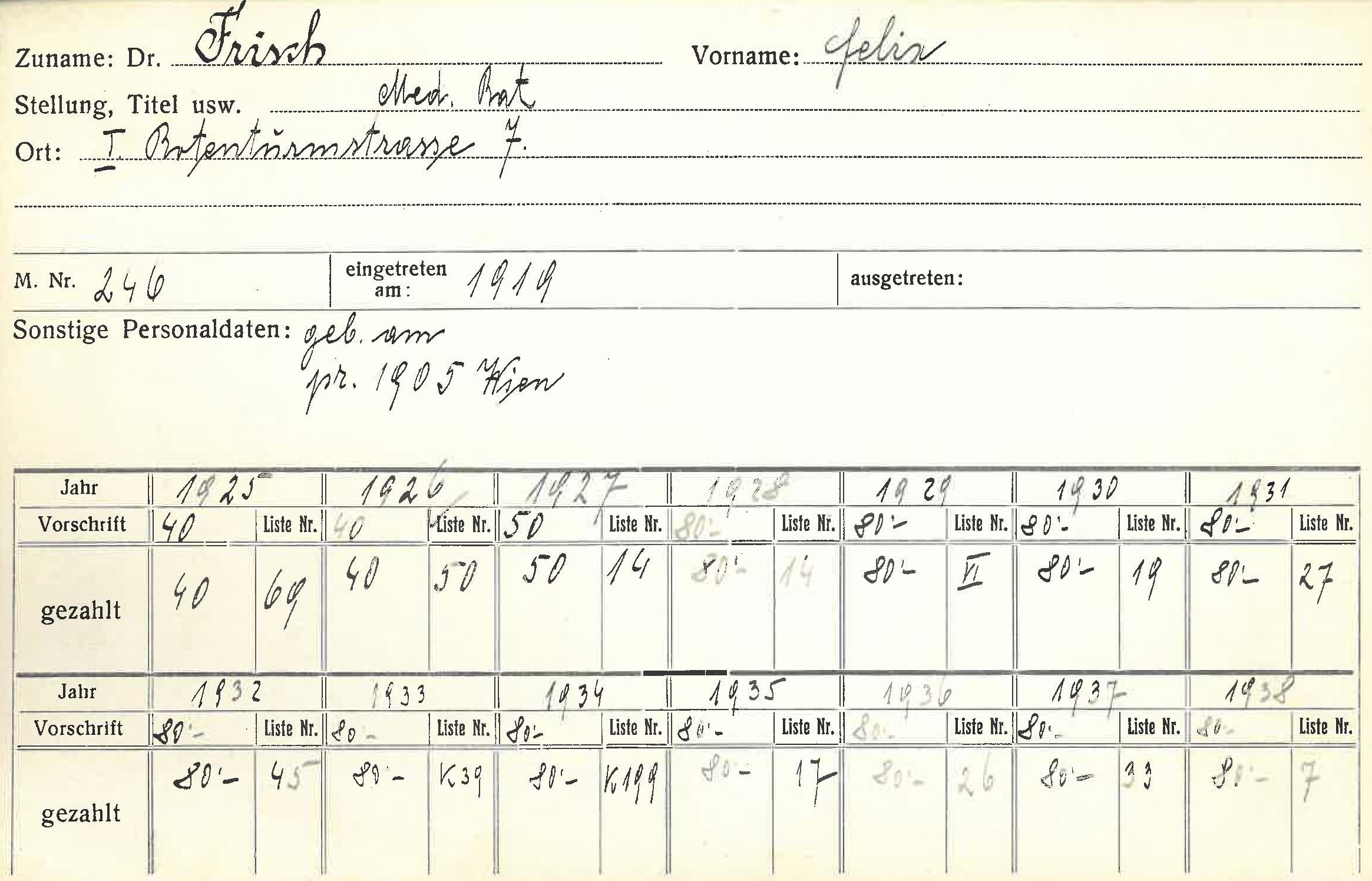Frisch hielt folgende Vorträge in der Gesellschaft der Ärzte in Wien: Das Serumeiweißbild als führendes Prinzip therapeutischer Versuche bei Epilepsie (4.5.1928), Der therapeutische Pneumozephalus im Kindesalter (11.4.1930).