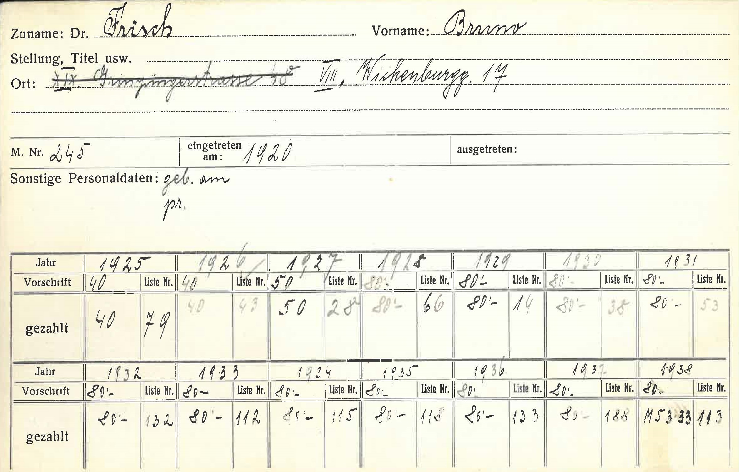 Bruno Frisch hielt folgenden Vortrag in der Gesellschaft der Ärzte in Wien: Behandlung der Kolipyelozystitis mit Bakteriophagen (29. 5. 1925).