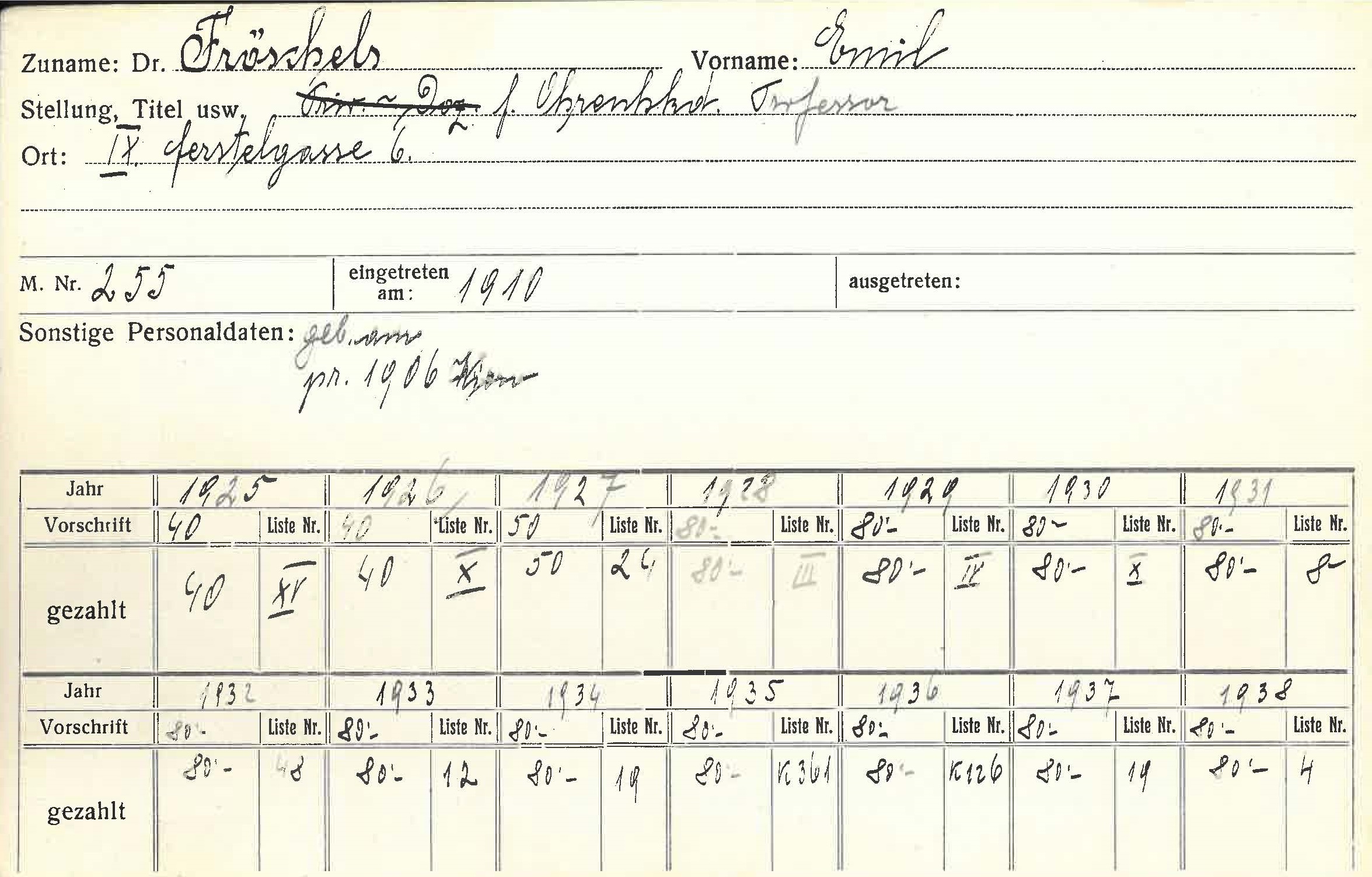 Emil Fröschels 24. August 1884, Wien – 18. Januar 1972, New York Emil Fröschels gilt als Begründer der Logopädie. Er führte den Begriff in den 1920er-Jahren in die medizinische Fachsprache ein. Nachdem er 1907 promoviert hatte, arbeitete er als Assistent an der Hals-Nasen-Ohren-Klinik der Universität Wien. 1910 gründete er das sprachund stimmärztliche Ambulatorium, das er lange Jahre leitete. Ein Jahr zuvor hatten er und Gertrud Töpfer im Stadttempel in Wien geheiratet. Nach seiner Habilitation 1914 war Fröschels als Vorstand der Abteilung für Sprachstörungen im Garnissonspital II in Wien tätig. Unmittelbar nach Kriegsende nahm er eine Anstellung am physiologischen Institut der Universität an. Ab 1927 trug er den Titel eines Titularprofessors. Während er weiterhin seine eigene Praxis im 9. Bezirk in Wien führte, war er auch als Vorstand der HNO-Klinik am Allgemeinen Krankenhaus tätig. Emil Fröschels engagierte sich nebenberuflich als Präsident der Internationalen Gesellschaft für Sprach- und Stimmheilkunde und war Präsident der Österreichischen Gesellschaft für experimentelle Phonetik. 1938 wurde er von der Universität Wien vertrieben. Anfang 1939 gelang ihm die Ausreise über die Niederlande in die USA. Als international bekannter und renommierter Experte seines Fachbereichs gelang es ihm, in den USA beruflich wieder Fuß zu fassen. Er erhielt eine Stellung als Research Professor an der Washington University St. Louis und wurde später Direktor der Voice and Speech Clinic am Mount Sinai Hospital in New York. 1941 zum Präsidenten of The New York Society for Speech and Voice Therapy ernannt, war Fröschels ab 1959 Präsident der Alfred Adler Clinic for Individual Psychology. Außerdem betrieb er eine Privatpraxis. Fröschels hielt folgende Vorträge in der Gesellschaft der Ärzte in Wien: Zur Behandlung der Aphasien (17.10. 1913), Hörübungen bei Sprachtaubheit (8. 12. 1909), Rhinolalia clausa und Sigmatismus lateralis (29. 10. 1909), Taub- und Hörstummheit (28. 10. 1910, 3. 3. 1911 und 8. 11. 1913), Nasenflügelatmen beim Sprechen der Stotterer (20. 10. 1911), Wesendes Stotterns (18. 10. 1912), Sprechen ohne Kehlkopf (9. 1. 1914), sprachärztliche Behandlung, insbesondere beim Gebrauch von Obturatoren (24. 4. 1914) und Lautstottern (19. 6. 1914), Über Kriegssprachstörungen (25. 6. und 5. 11. 1915, 7. 1. 1916), sprachärztlich behandelte Aphasien (18. 12. 1914}, Sprachfehler bei Schwerhörigkeit (17. 11. 1916), Echolalle (1. 12. 1916), expressiv auditive Aphasie (25. 6. und 5.11. 1915, 27. 4. und 4. 5. 1917, 1. 2. 1918}, hysterischer Mutismus (15. 6. 1917), motorische Aphasien (1. 2. 1918), Stimmumfang von fünf Oktaven (20. 1. 1922), Neues aus der Statterforschung (4. 1. 1924}, Oesophagusatmung eines Laryngektomierten (30. 4. 1926), ein weiblicher Tenor (17. 12. 1926), zur Behandlung der Lähmungserscheinungen und Atembeschwerden bei doppelseitiger Recurrens-Lähmung (8. 2. 1935) und ein Fall von Mutationsstimmstörung (12. 5. 1937), von H. Stern Grundprinzipien der Sprach- und Stimmausbildung bei Laryngektomierten (9. 4. 1920} sowie Gaumensegellähmung ohne nachweisbare Ursache (25. 6. 1920} und von L. Stein neue logopädisch-phoniatrische Apparate (13. 3. 1936) und ein Fall von zentraler Sprachstörung (11. 12. 1936), (mit Sekalit) (15. 6. 1928, 21. 6. und 5. 7. 1929) Gaumenobturatoren. Text nach Gedenkbuch Uni Wien, Gedenkbuch Josephinum, Isidor Fischer/Josef Hlade |