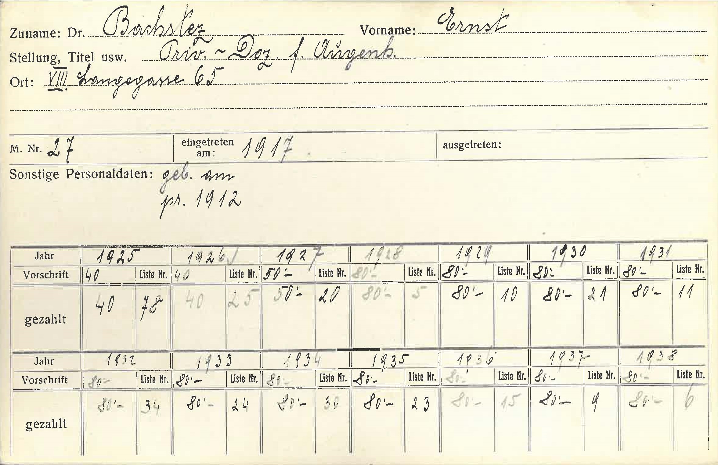 Zulassung erlosch jedoch mit August 1943. Erst nach Kriegsende, im August 1945, erhielt Ernst Bachstez wieder eine Lehrerlaubnis und kehrte an die Universität Wien zurück. Auch war er Wieder praktisch tätig, als Konsiliarfacharzt der Poliklinik.