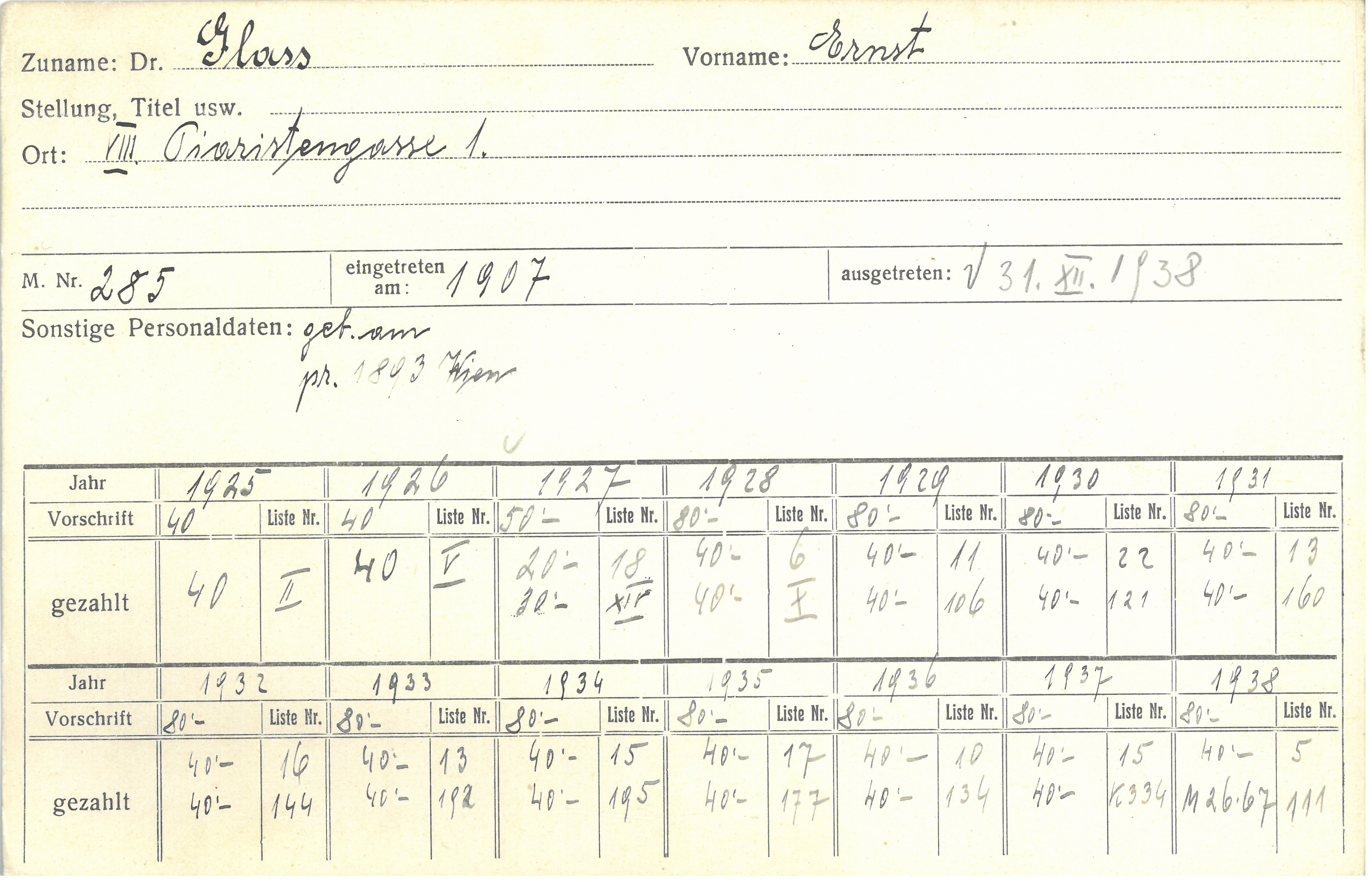 Ernst Glass gelang nach dem "Anschluss die Flucht in die Schweiz, wo er 1944 in Lausanne verstarb. Seine Frau Berta (geb. Zaitschek, 1883-1946) verstarb 1946 in Bologna, wo sie nach dem Tod ihres Gatten bei ihrer Tochter Therese Glass (verh. Biavati) lebte.