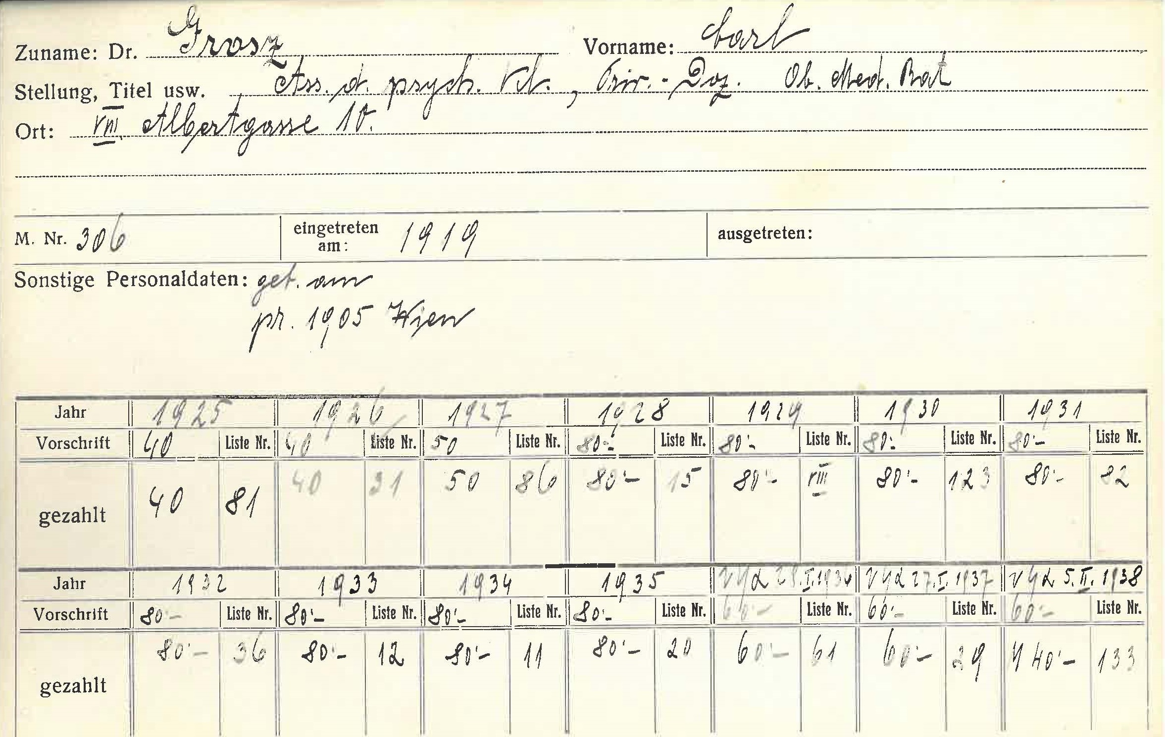 Karl Grosz hatte 1905 seine Promotion zum Dr. med. erreicht und arbeitete