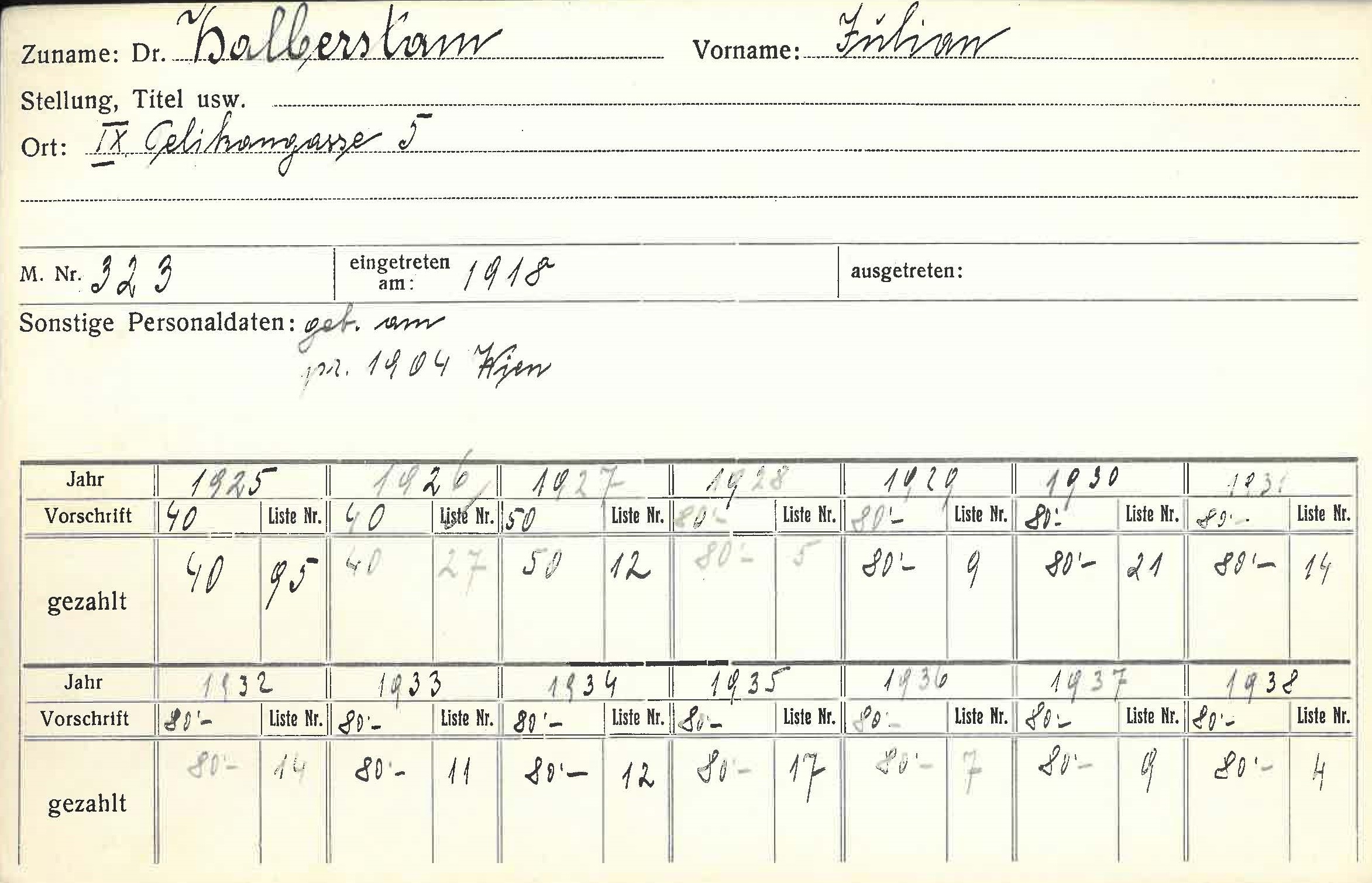 Julian Halberstam (1879-1958) war ab 1922 Direktor des Sanatorium Löw. Er studierte in Wien Medizin und arbeitet vermutlich seit den 1910er Jahren als Arzt im Sanatorium Löw. 1939 wurde er nach dem „Anschluss“ als Direktor entlassen. Ihm gelang nach dem "Anschluss" die Flucht in die Schweiz.