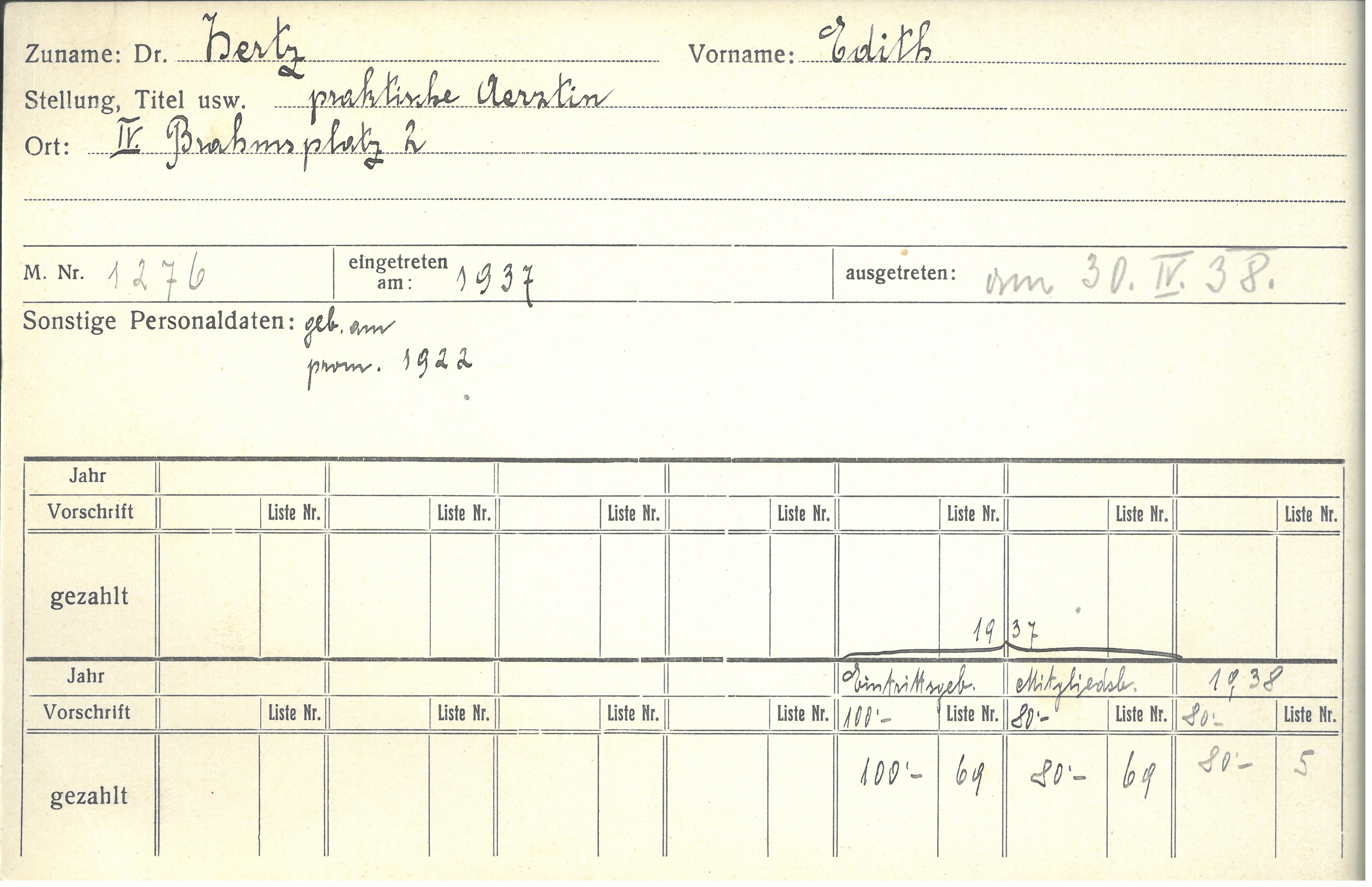 Edith Hertz (geb. Hirsch) war mit dem Nationalökonomen und Soziologen Friedrich Otto Hertz verheiratet, bekannt für seine Beiträge zur Rassismusforschung). Sie gab am 30.04.1038 ihren Austritt bekannt.