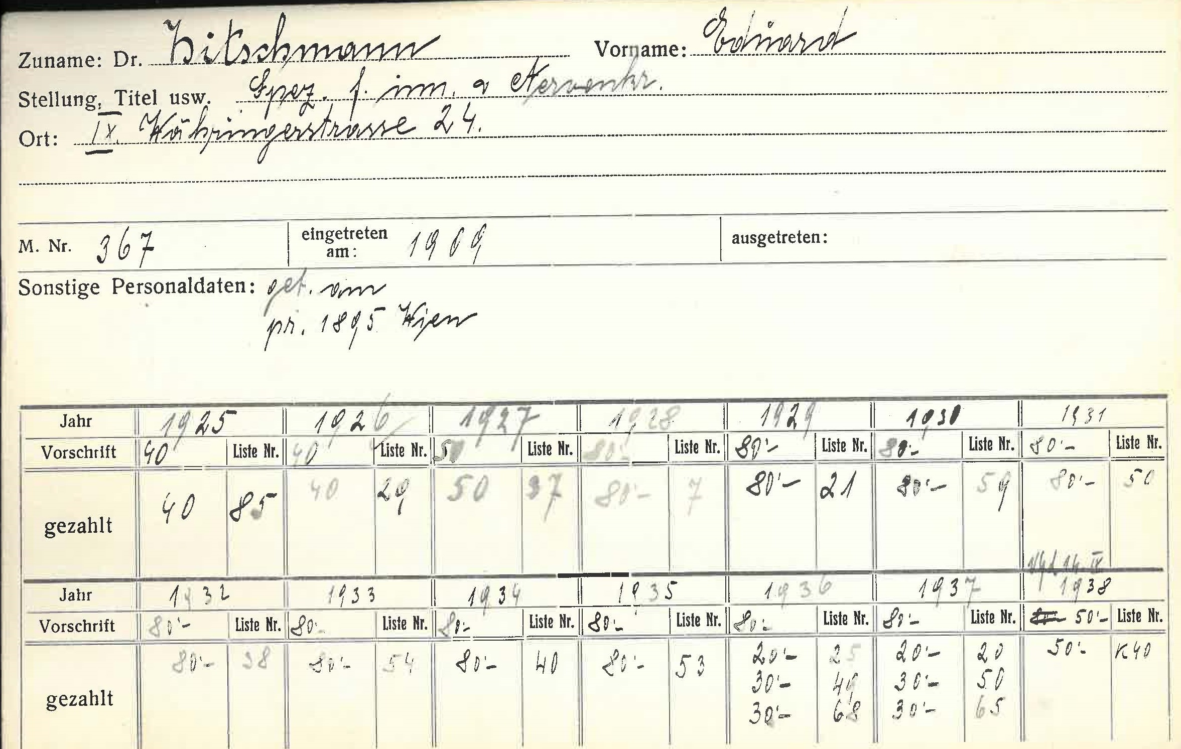 Eduard Hitschmann (1871-1957) gelang mit seiner Familie zunächst die Flucht nach England. Er verließ England nach dem Tod Freuds, um sich in Cambridge, Massachusetts in den USA niederzulassen. Er war am Boston Psychoanalytic Institute tätig und unterrichtete an der Harvard Medical School. Er starb 1957.