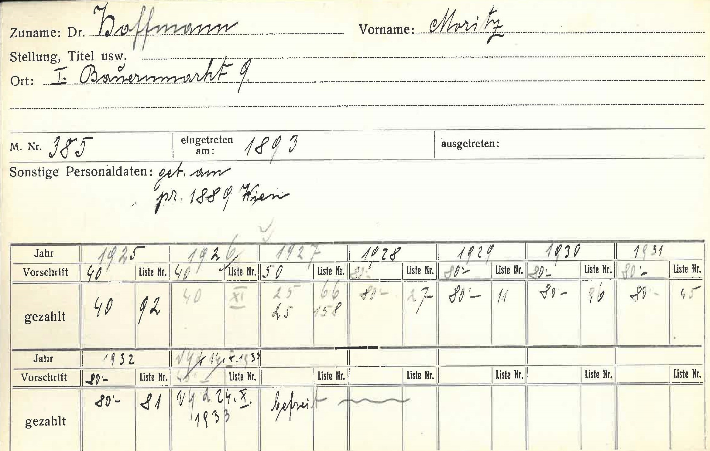 Moriz Hoffmann (1864-1940) kann zunächst nach dem „Anschluss“ nach Belgien flüchten. 1940 begeht er aufgrund der Bedrohung durch das NS-Regime Selbstmord. Text: Josef Hlade