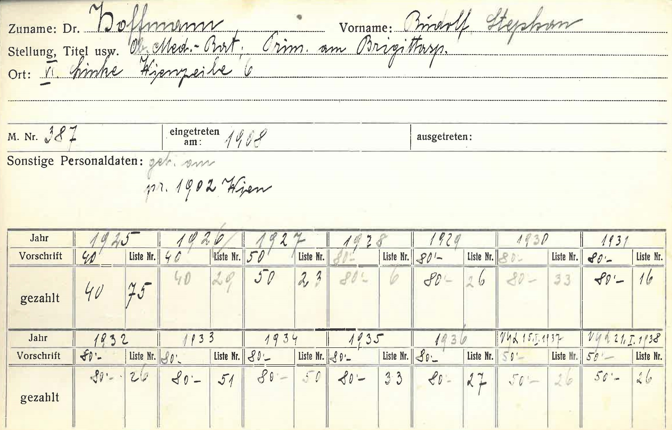 Der aufgrund seiner jüdischen Herkunft nach dem „Anschluss“ verfolgte Rudolph Stephan Hoffmann starb 1939 an einem bis jetzt unbekannten Ort. Hoffmann war nicht nur von seiner Ausbildung her Arzt, sondern auch Musikschriftsteller und Musikkritiker. Des Weiteren trat er auch als Komponist und Librettist in Erscheinung und war Dirigent des Philharmonischen Chores und der Wiener Singakademie.