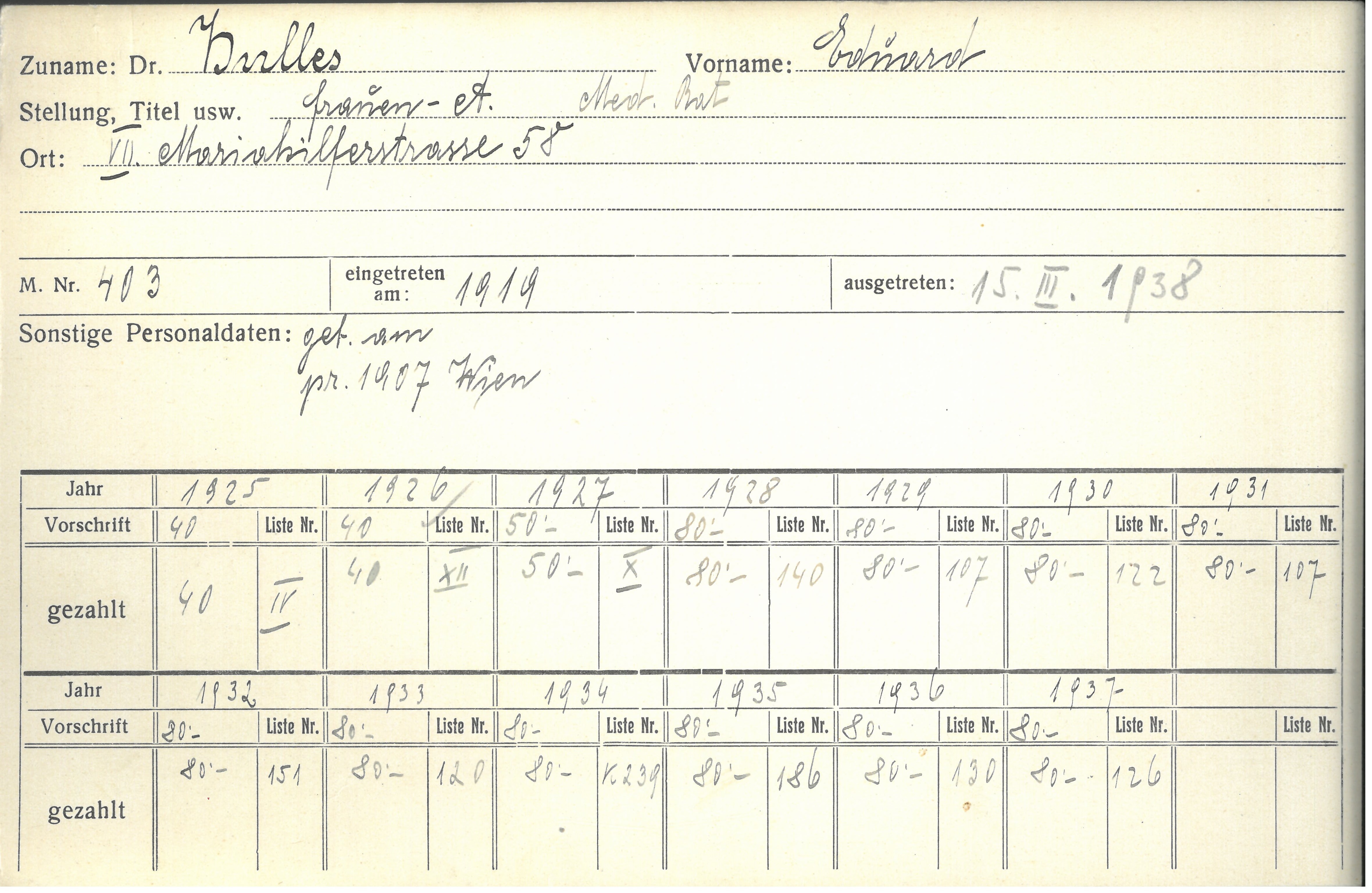 Adresse (von Karteikarte) Mariahilfer Straße 58, 1070 Wien