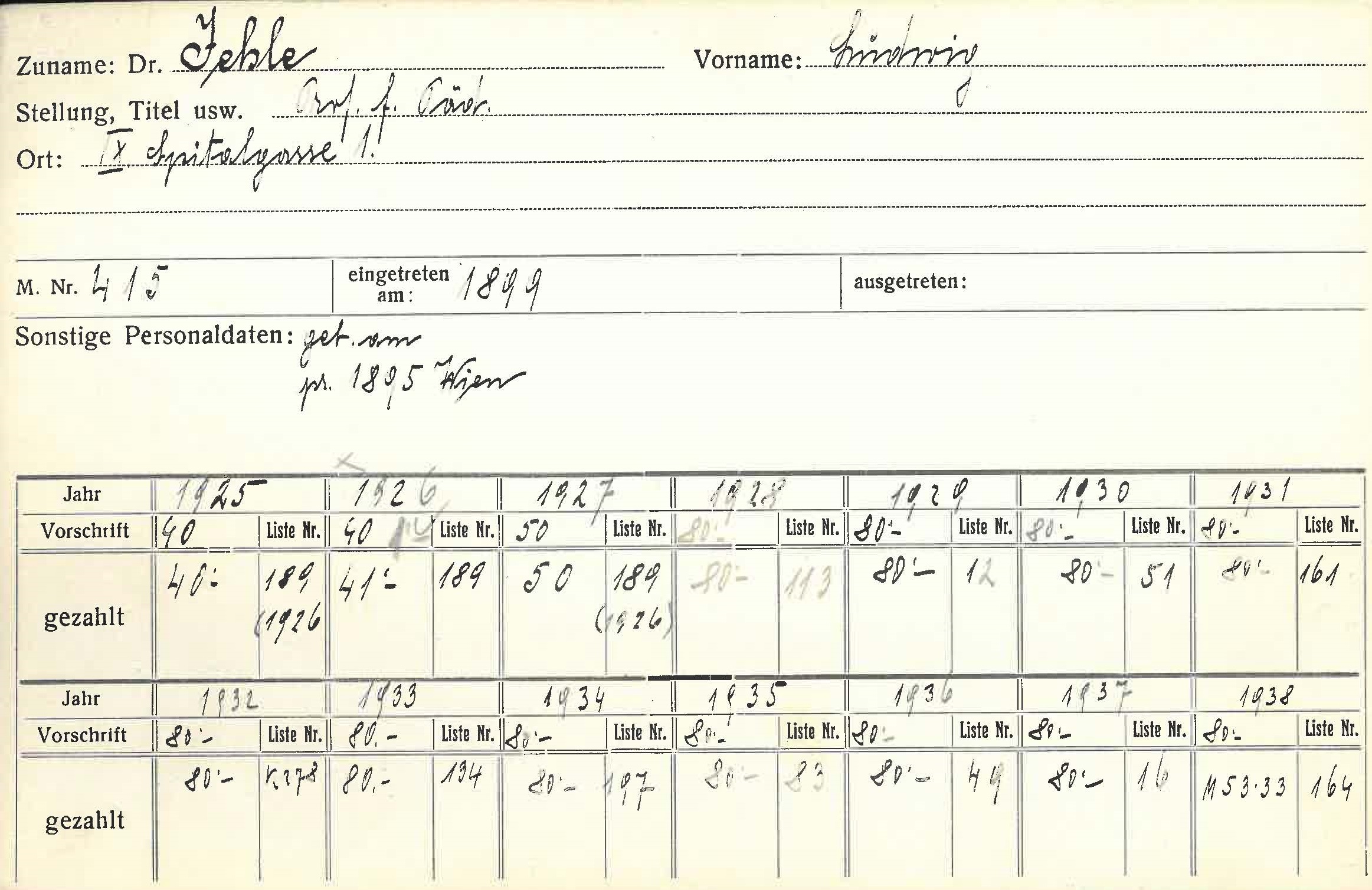 Ludwig Jehle habilitierte 1910 an der Universität Wien im Fachgebiet der Kinderheilkunde und übernahm die Position des Primararztes an der II. Kinderabteilung an der Allgemeinen Poliklinik. Er war bis zu deren Stilllegung nach dem "Anschluss" ihr Leiter. Er verstarb am 1. März 1939, noch bevor ihm die Lehrbefugnis entzogen werden konnte.
