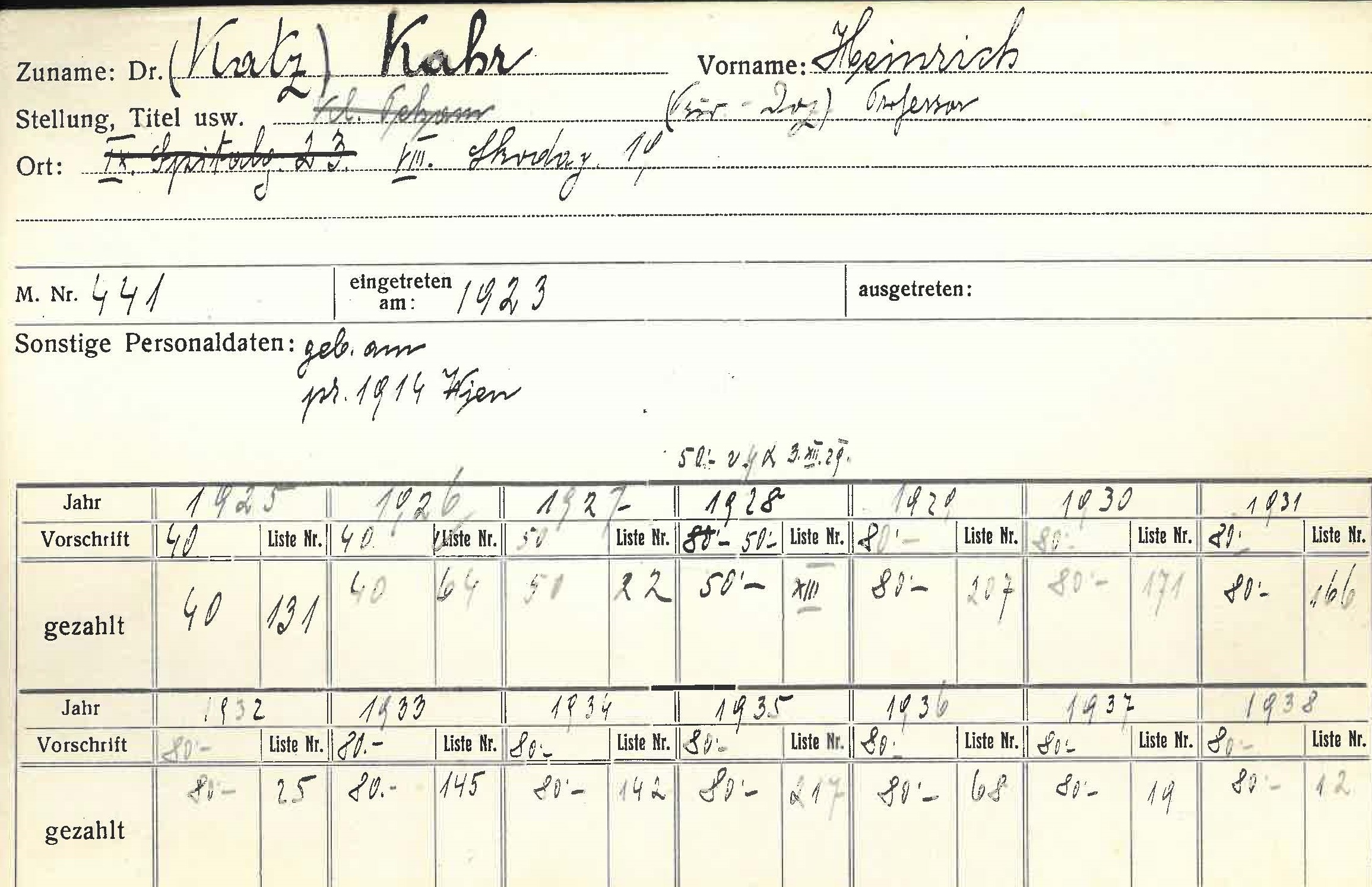 Heinrich Kahr (geborener Katz) promovierte 1914 in Wien. Nach dem Militärdienst