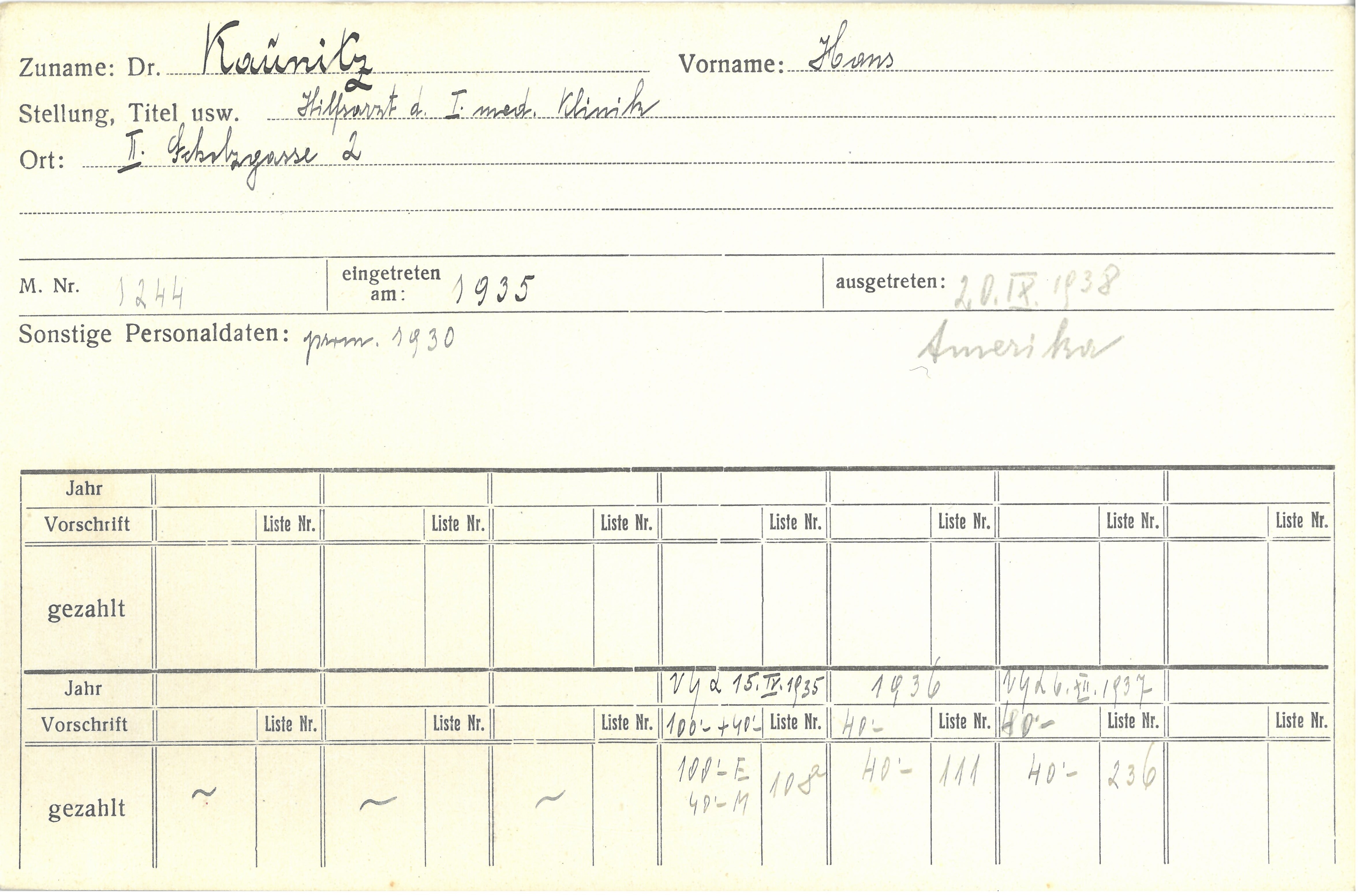 Hans Kaunitz (1905–1996) war Assistent an der Klinik Hans Eppingers (1879-1946). Kaunitz gelang nach dem „Anschluss“ die Flucht nach New York, wo er schließlich zu einem bedeutenden Internisten aufstieg. Nach ihm ist der Hans-Kaunitz-Award benannt, der für Forschung auf dem Gebiet der Fette, Öle, Proteine, Tenside und verwandter Stoffe vergeben wird. Kaunitz wird 1988 im Zuge von K. H. Spitzys Gedenkbemühungen wieder als Ehrenmitglied der Gesellschaft der Ärzte aufgenommen. Spitzy, der Kaunitz möglicherweise von der Klinik Eppinger her kannte, bezeichnete dieses Vorgehen als „eine längst notwendige Abstattung einer Dankesschuld“ der „Gesellschaft der Ärzte in Wien“.