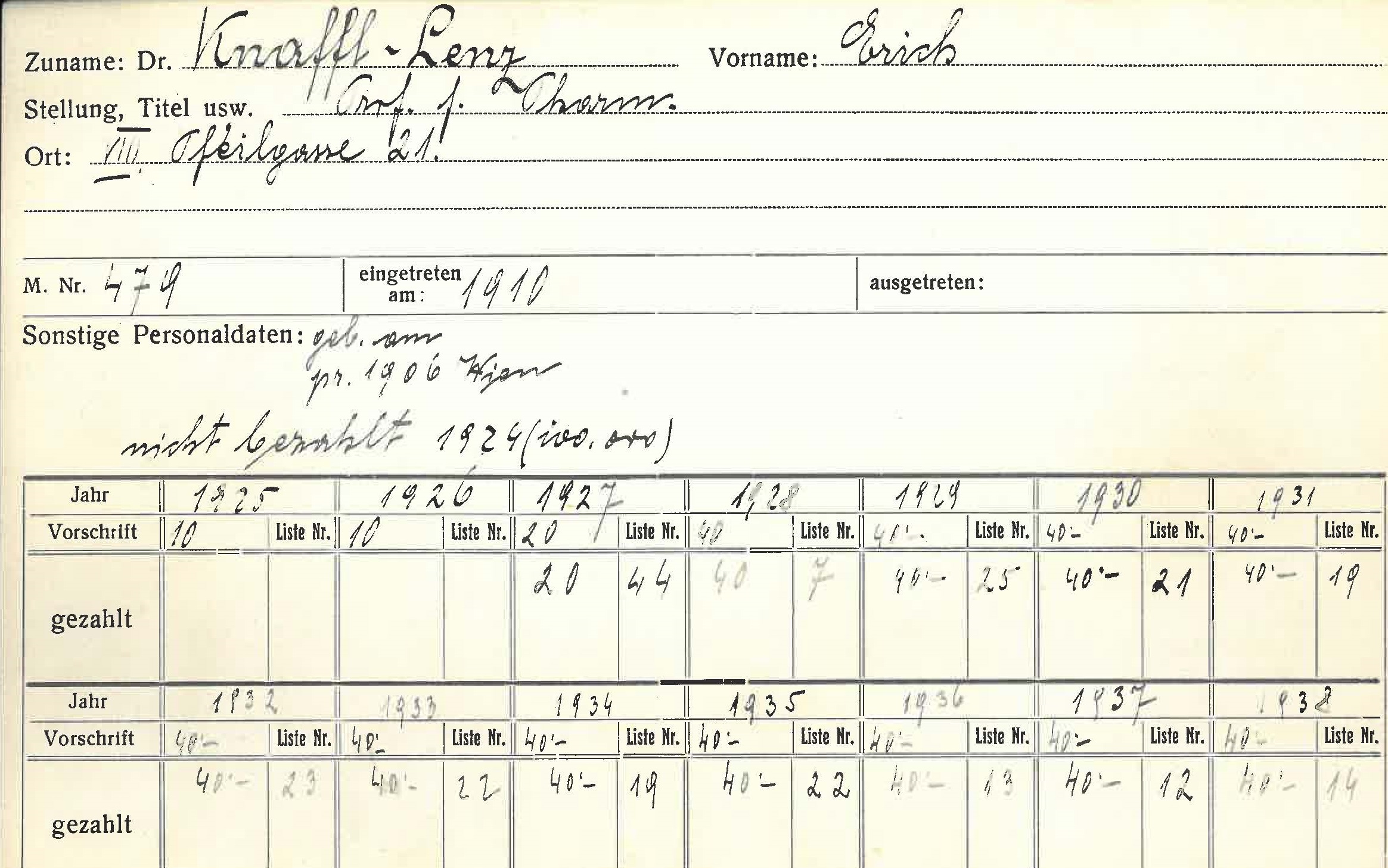 und musste seine Vorlesungstätigkeit einstellen. Zunächst konnte KnafflLenz zumindest im Laboratorium weiterarbeiten. Auch nach dem „Anschluss“ wurde er zunächst weiterbeschäftigt. Im April 1938 suchte er um