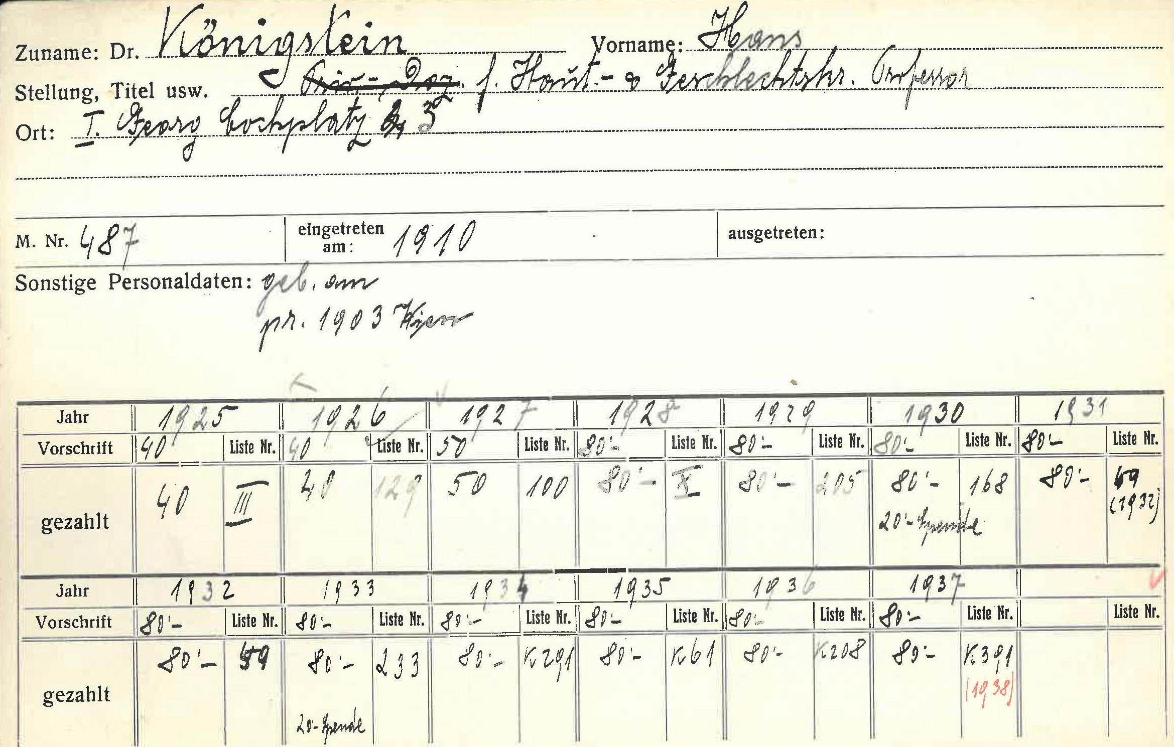 An der medizinischen Fakultät lehrte Königstein als Dozent für Haut- und