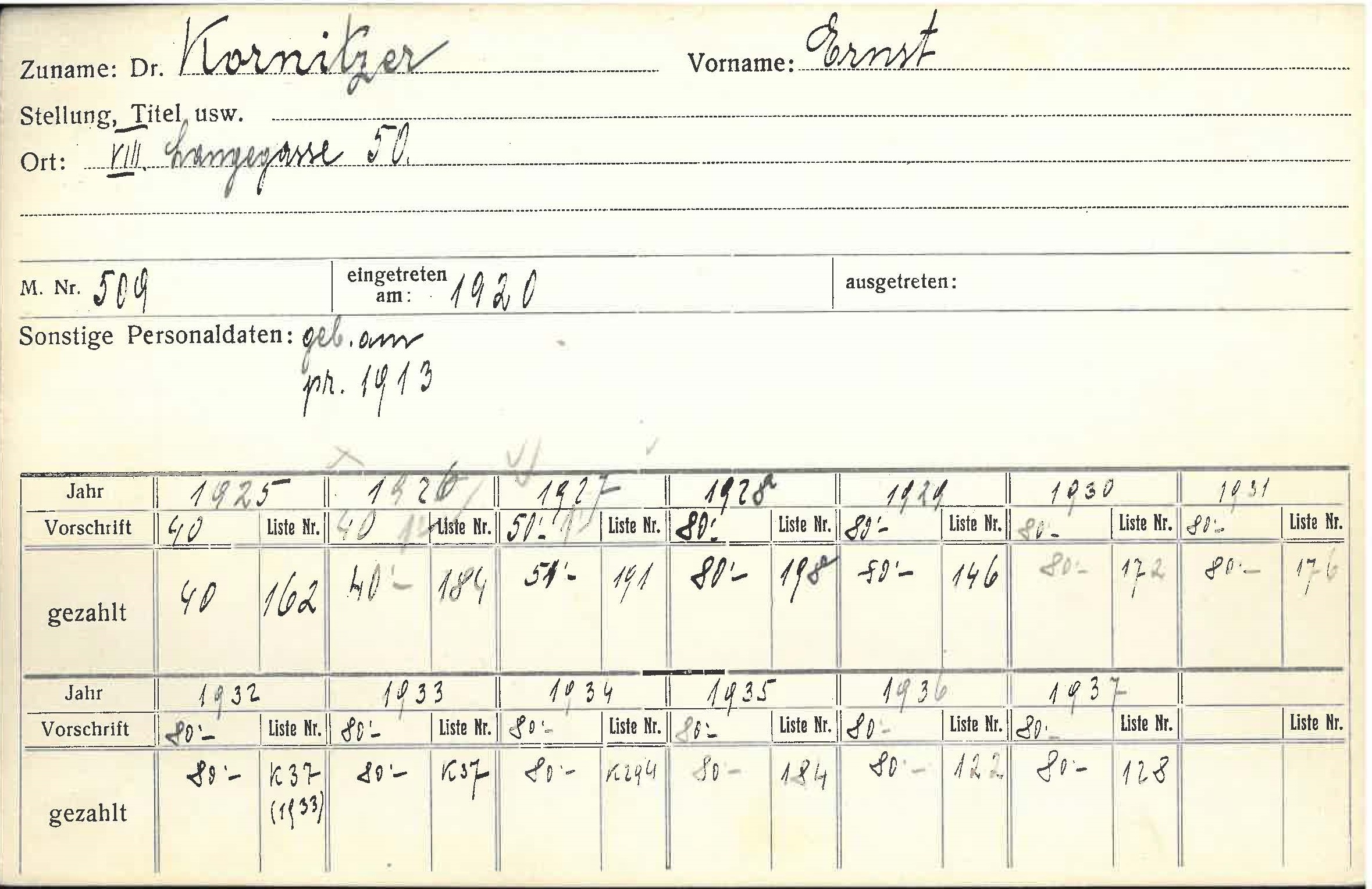 Der Urologe Ernst Kornitzer (1889–1957) war mit Kitty Kornitzer (1898–1941) verheiratet, einer österreichischen Schriftstellerin, die 1941 in der Tötungsanstalt Hartheim ermordet wurde. Kitty Kornitzers Mutter wurde in Theresienstadt ermordet. Ernst Kornitzer gelang 1939 die Flucht und wurde 1945 amerikanischer Staatsbürger. Er verstarb 1957 in Bellinzona.