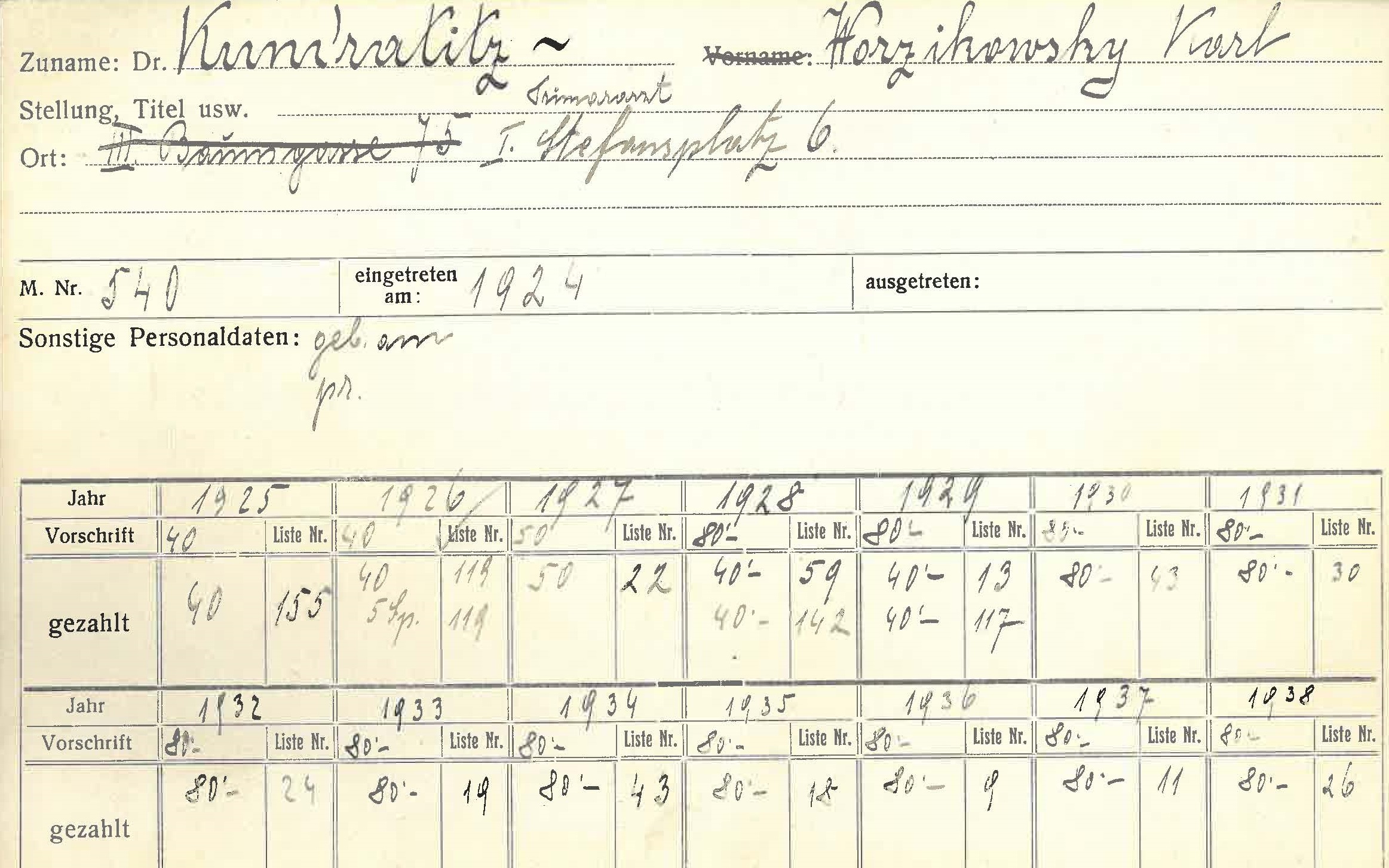 Kundraditz-Worzikowsky war Schulärztin und in der Kinderfürsorge tätig. Sie war die Gattin von Karl Kundratitz, dem späteren Ordinarius für Pädiatrie. Ihre Ehe wurde 1938 von den Nazis als „Mischehe“ eingestuft. Text: Josef Hlade