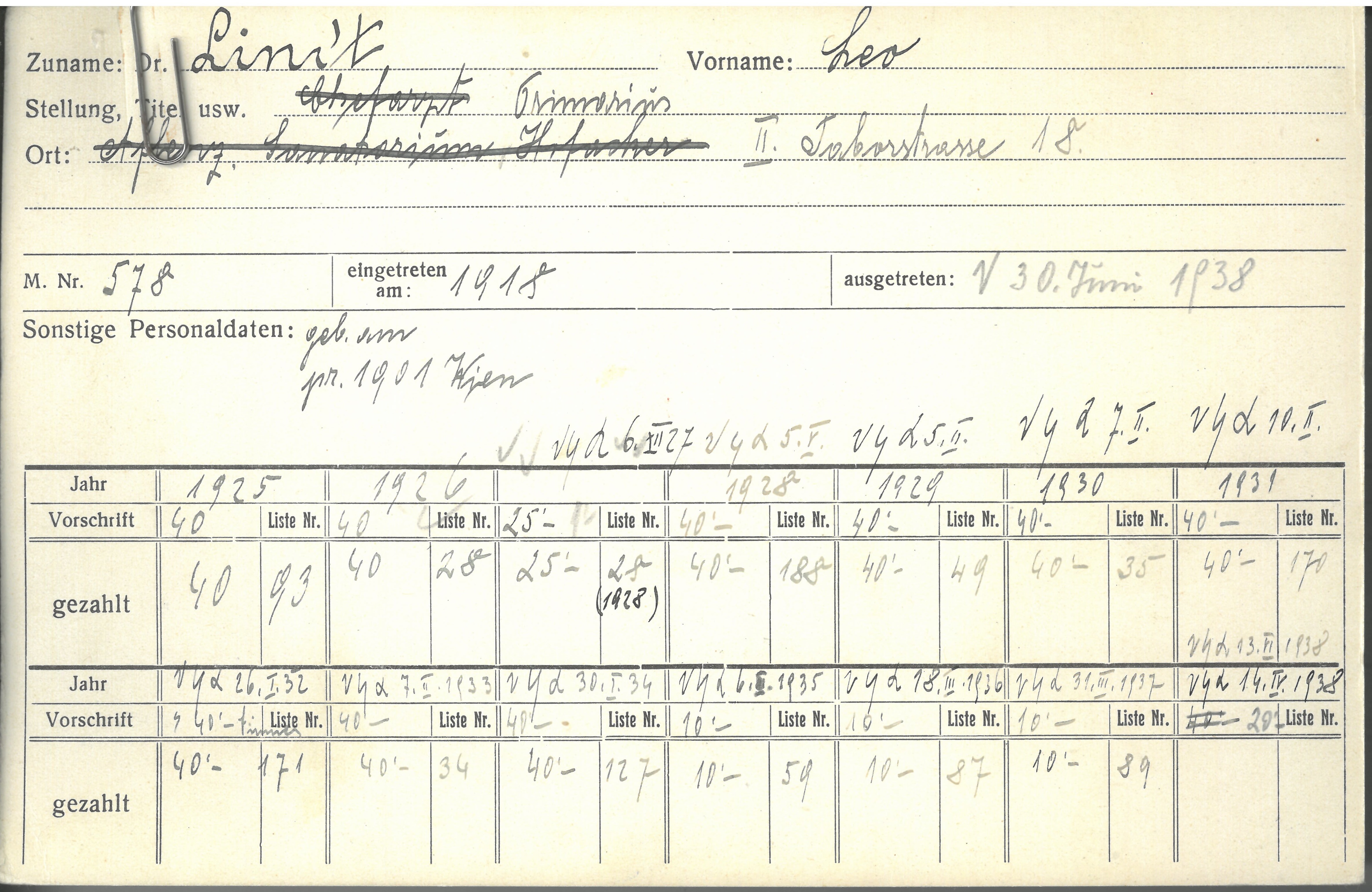 Adresse (von Karteikarte) Taborstraße 18, 1020 Wien
