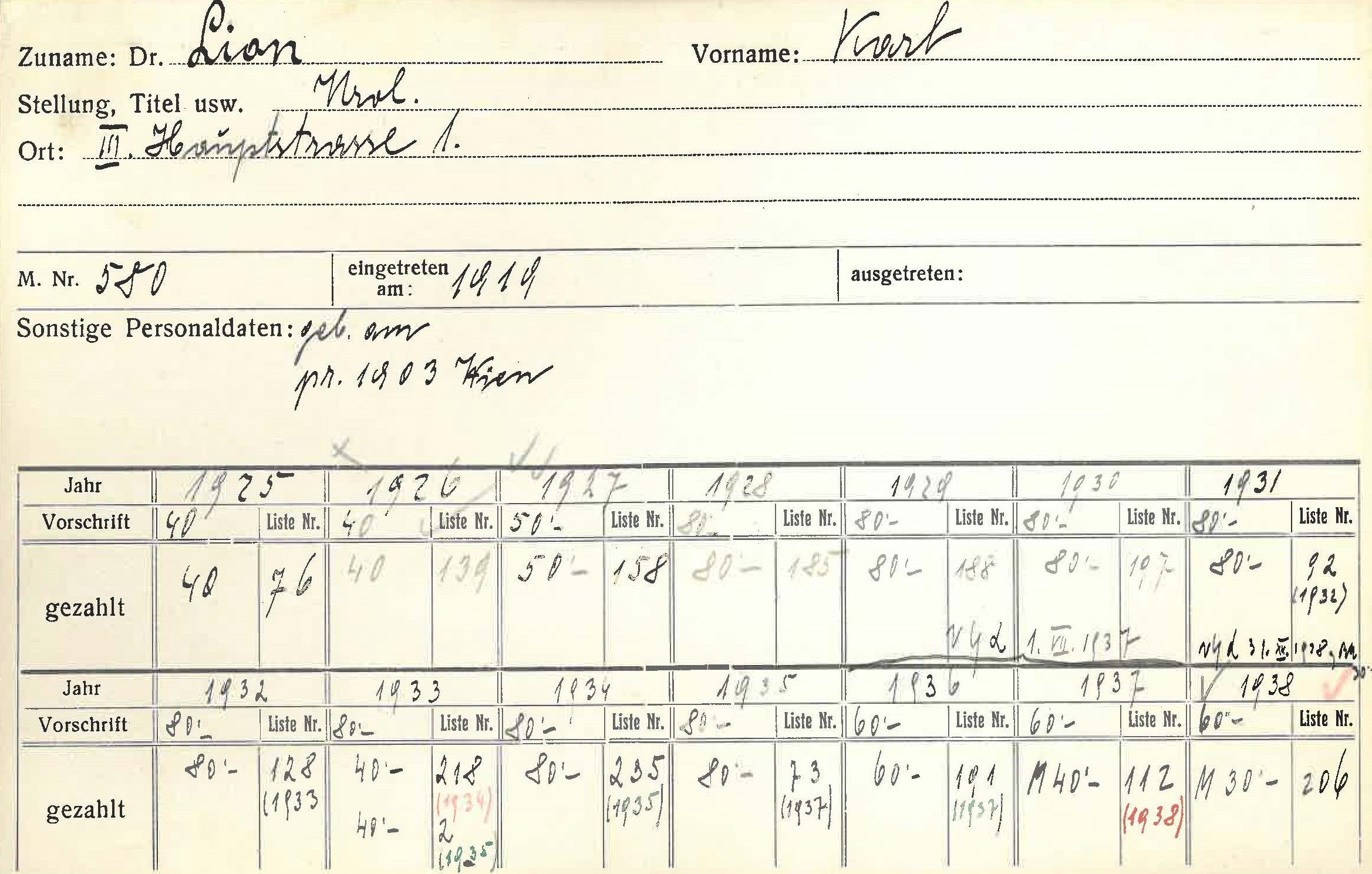 Karl Lion gelang 1939 im letzten Moment die Flucht nach Großbritannien. Begleitet wurde er von seinen beiden Töchtern Frieda und Ilse sowie seiner ebenfalls als Ärztin tätigen Gattin Gisela, geb. Meitner (1879-1966). Sie war die Schwester der Kernphysikerin Lise Meitner (1878-1968).