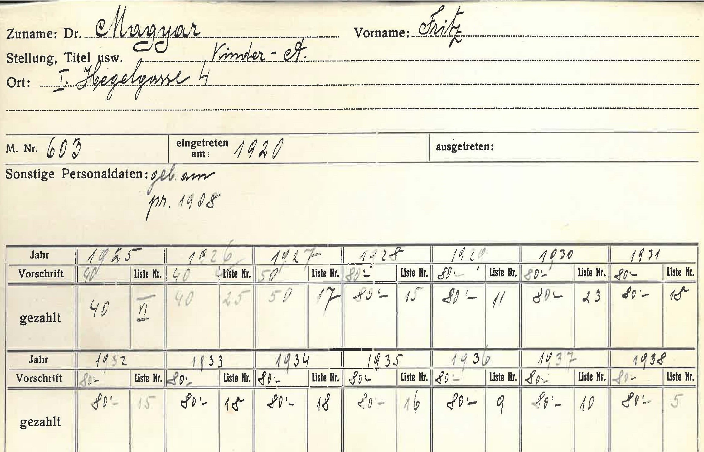 Adresse (von Karteikarte) Hegelgasse 4, 1010 Wien