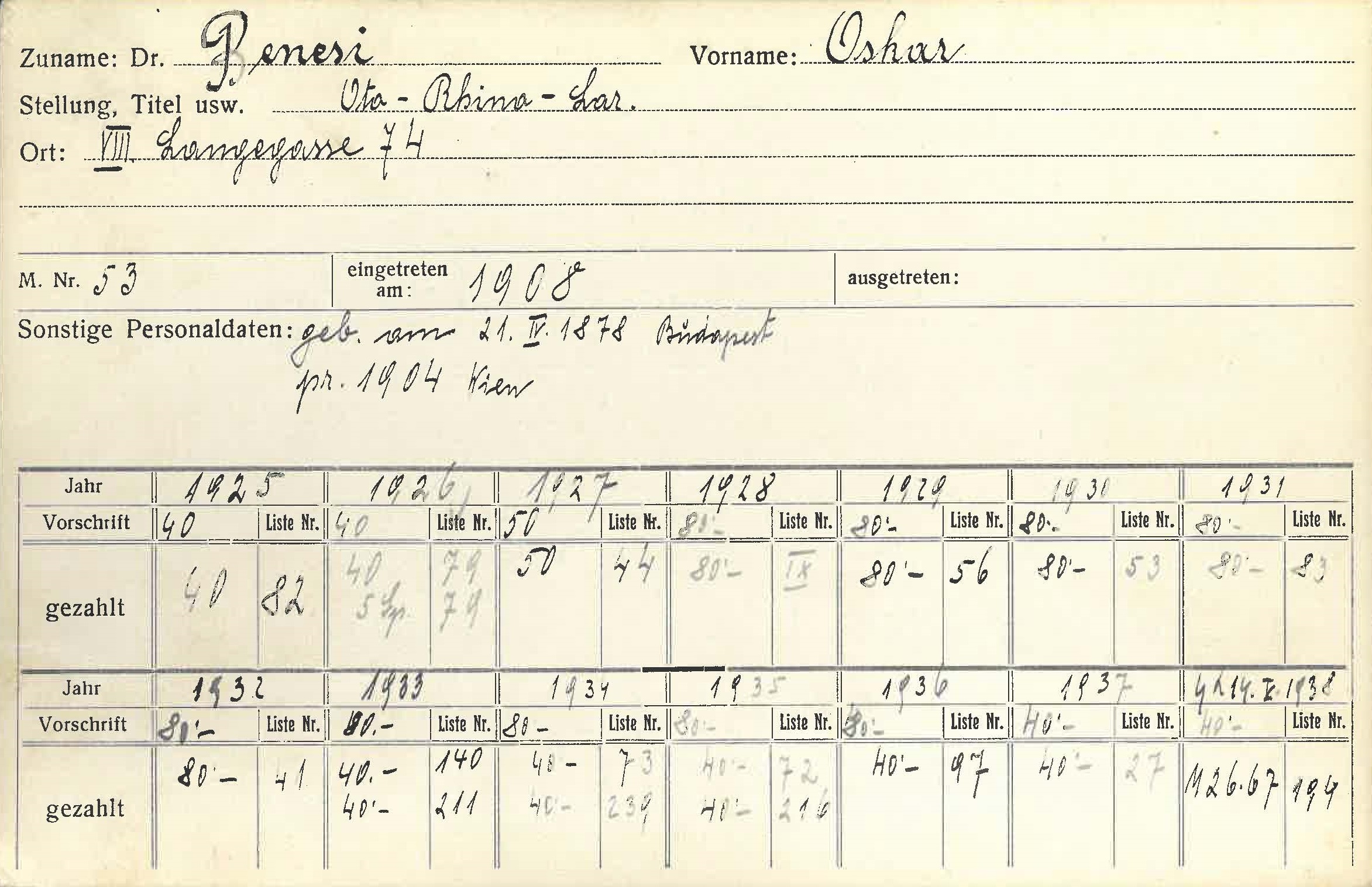 Bénesi hielt folgende Vorträge in der Gesellschaft der Ärzte in Wien: Über Hypernephrommetastase im Ohr (9.1.1914).
