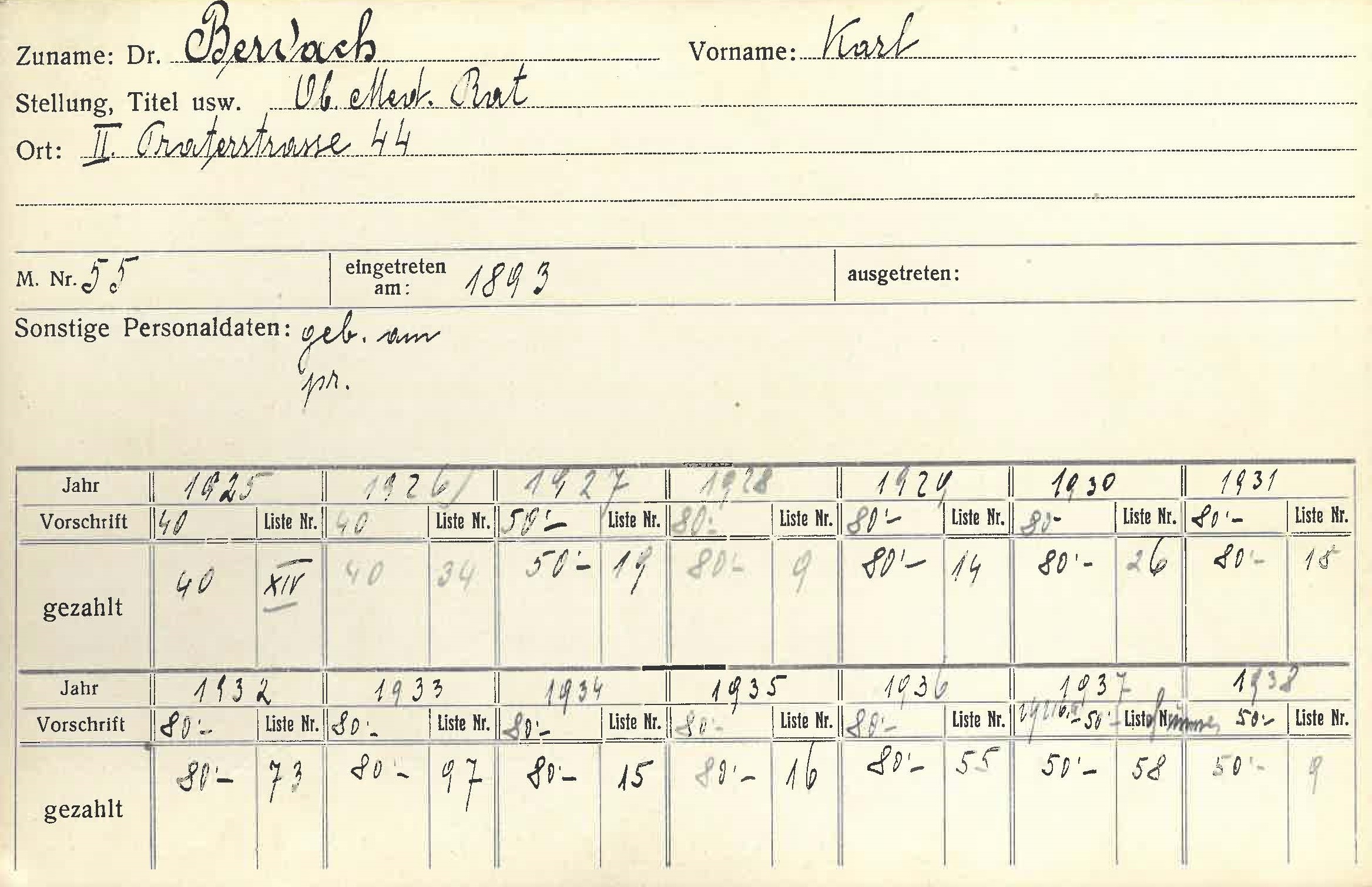 Berdach war städtischer Oberbezirksarzt. Er hielt folgende Vorträge in der Gesellschaft der Ärzte in Wien: Rhythmoskop (31.5.1907), Über endemischen Singultus (12.3.1897).