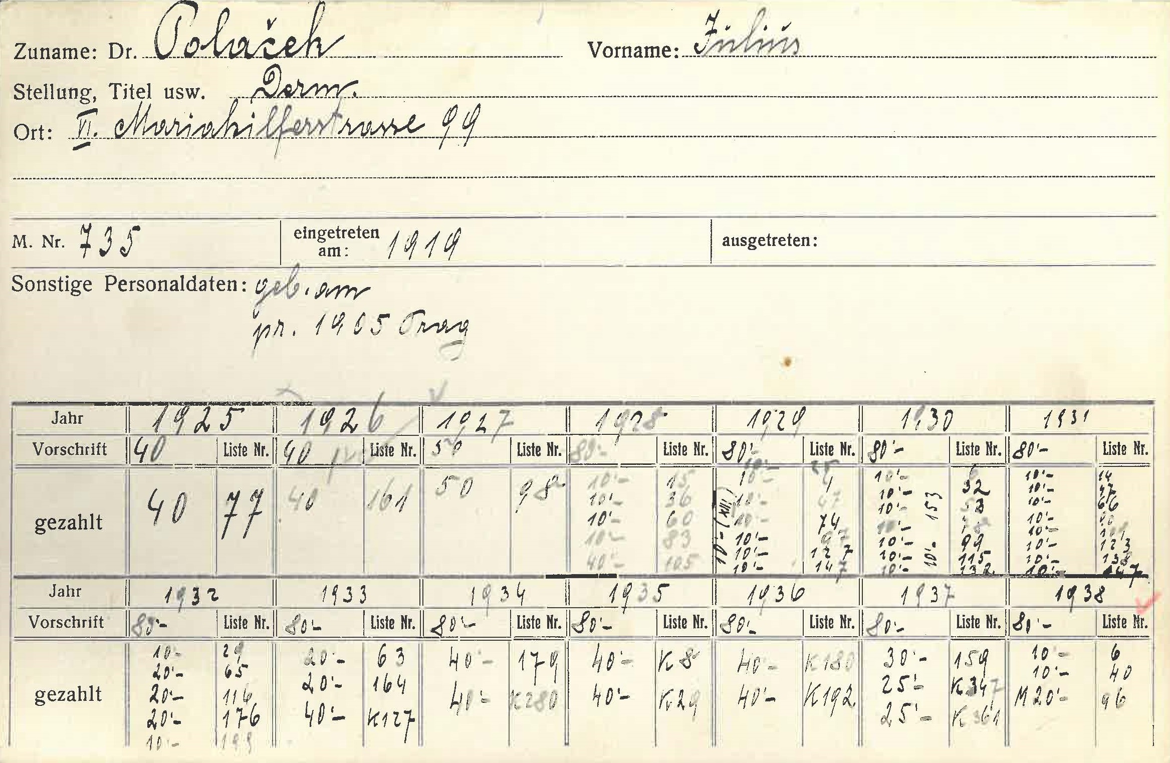 Holocaustopfer; stirbt am 9. März 1944 in Auschwitz. Julius Poláček ging nach dem "Anschluss" nach Prag. Er wurde am 6. März 1943 gemeinsam mit seiner Frau und seinen Söhnen in das Ghetto Theresienstadt deportiert. Am 6. September 1943 wurden sie nach Auschwitz deportiert.