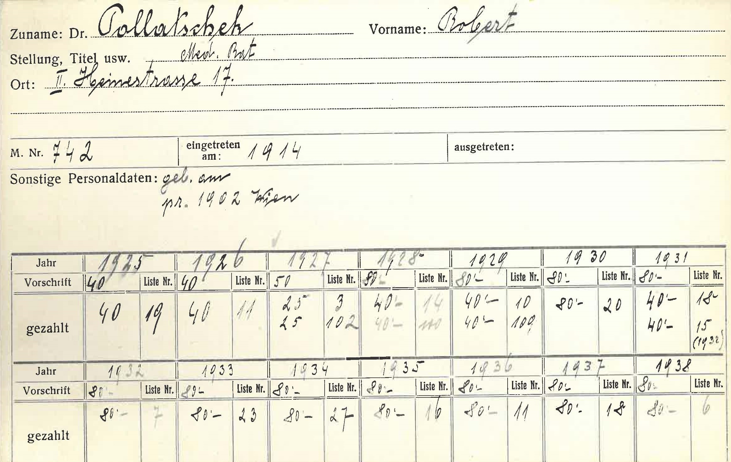 Holocaustopfer, stirbt am 1.5.1940 in Wien durch Suizid. Robert und Marianne Pollatschek starben durch Suizid am 1. Mai 1940 in ihrer Wohnung in Wien. Ihr Sohn Georg (1910-1997) floh in die USA und nahm dort den Namen George Porter an.