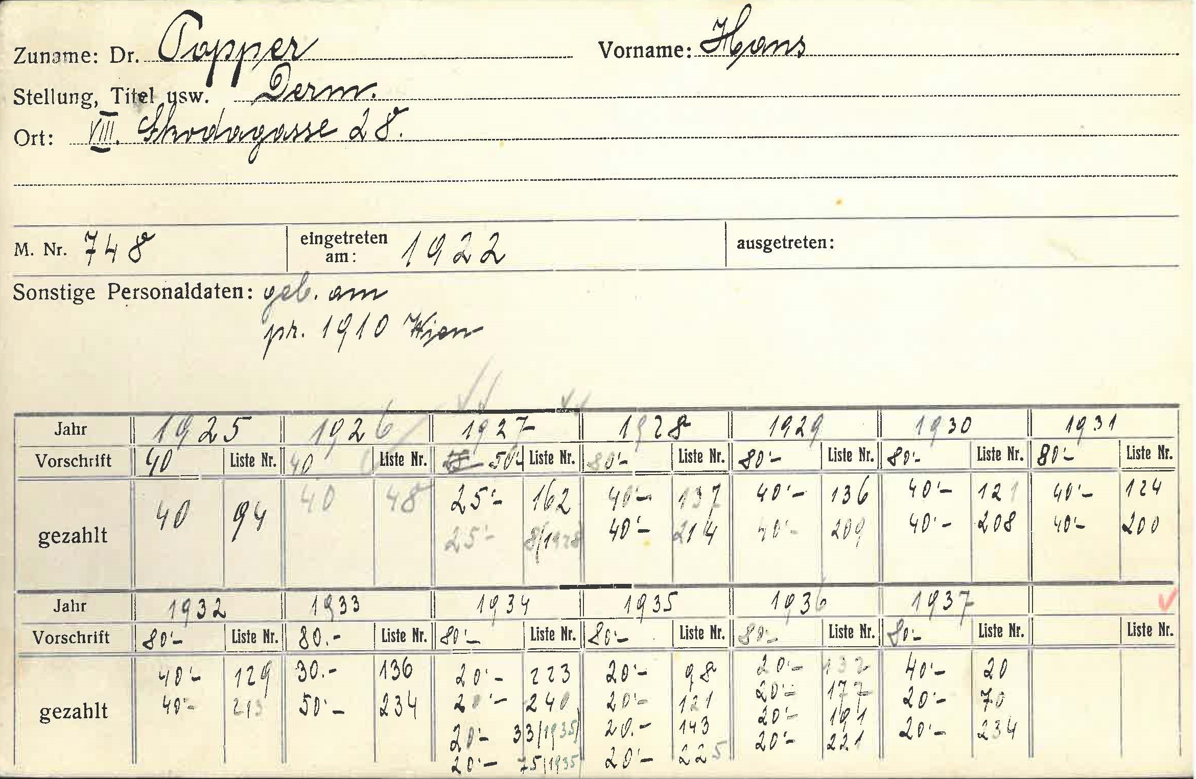 Adresse (von Karteikarte) Skodagasse 28, 1080 Wien