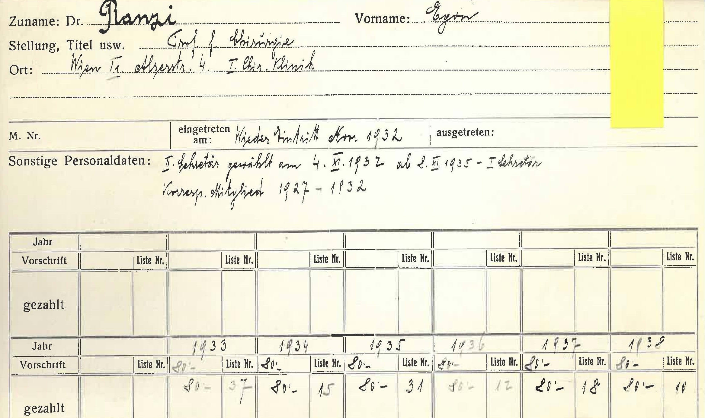 Egon Ranzi promovierte 1899 und hatte bereits während seiner Studienzeit als Demonstrator an der anatomischen Lehrkanzel unter Carl Toldt gearbeitet. Ab 1901 war er Operationszögling an der I. chirurgischen Klinik unter Anton v. Eiselsberg, wo er bis 1919 als Assistent tätig war. In dieser Zeit konnte er sich für Chirurgie habilitieren und erhielt bald darauf den Titel eines außerordentlichen Professors. Neben seiner Lehrtätigkeit war Ranzi Primararzt und Vorstand der I. chirurgischen Abteilung an der Krankenanstalt Rudolfstiftung in Wien. 1924 wurde er Ordinarius und Vorstand der chirurgischen Universitätsklinik in Innsbruck. Im Studienjahr 1929/30 Dekan in Innsbruck, kehrte Ranzi 1932 als Ordinarius und Vorstand der I. chirurgischen Klinik an die Universität Wien zurück. Im Austrofaschismus bekleidete Egon Ranzi eine Vielzahl maßgeblicher Funktionen. Unter anderem war er Mitglied des Bundeswirtschaftsrates und des Sozialpolitischen Ausschusses. In der Vaterländischen Front in führender Position tätig, war er zudem Obmann des Reichsbundes österreichischer Ärzteorganisationen und 2. Vizepräsident des Obersten Sanitätsrates. Im Studienjahr 1936/37 amtierte er als Mitglied des Senats der Universität, 1937/38 als Dekan der medizinischen Fakultät. Nach dem „Anschluss“ war Egon Ranzi aufgrund seiner Nähe zum Austrofaschismus schweren Repressalien ausgesetzt. Er war über mehrere Wochen im Polizeigefangenenhaus Elisabethpromenade inhaftiert und wurde schließlich im Mai 1938 von der Universität zwangsweise in den Ruhestand versetzt. Weitere zu erwartende Maßnahmen gegen seine Person erlebte Egon Ranzi nicht mehr, er verstarb im Juni 1939.