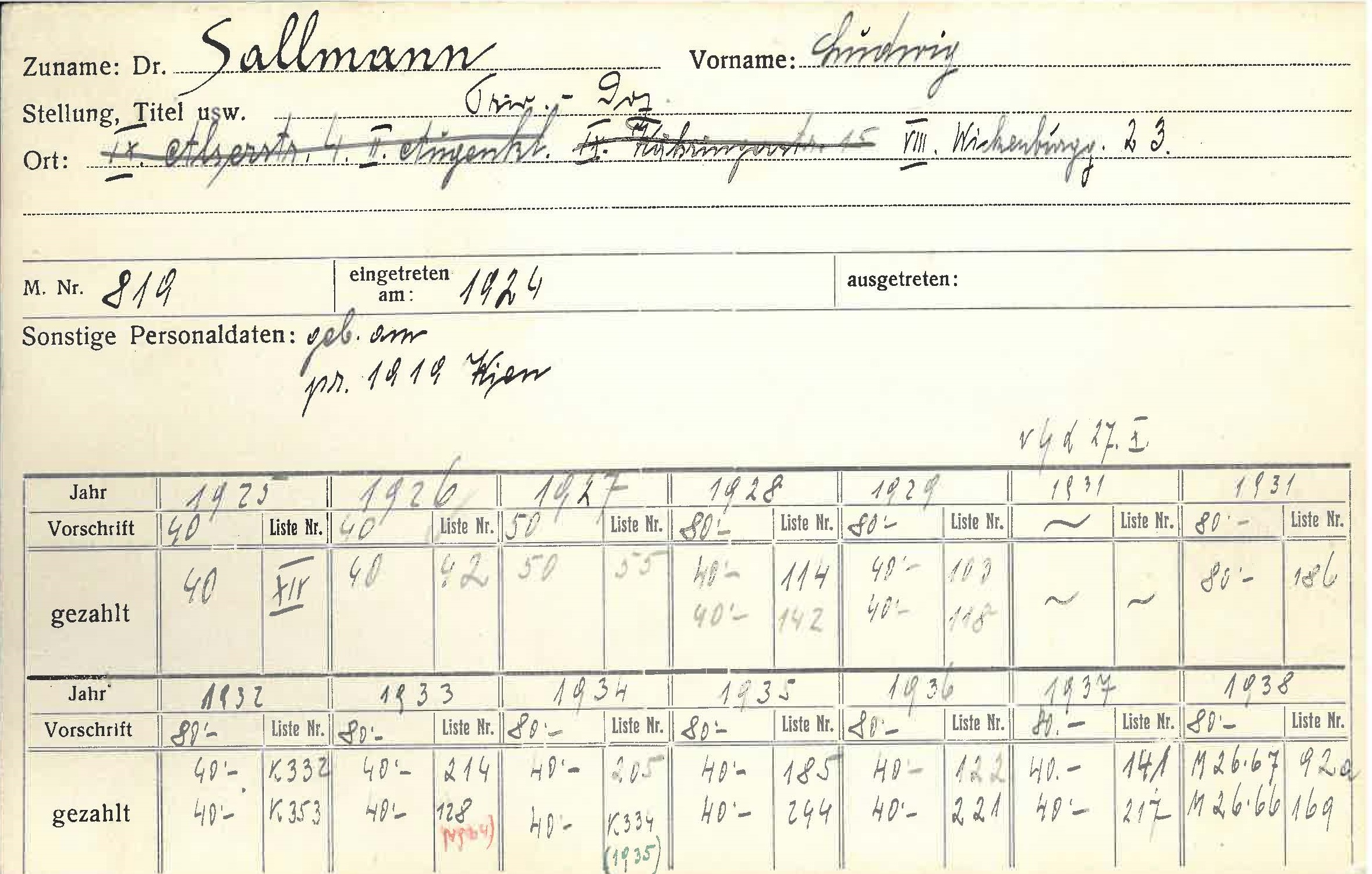 8. Juni 1892, Wien – ? Der Ophthalmologe Ludwig Sallmann war bis zum „Anschluss“ Mitglied des Verwaltungsrates der Gesellschaft der Ärzte in Wien. Ihm gelang 1939 die Flucht.