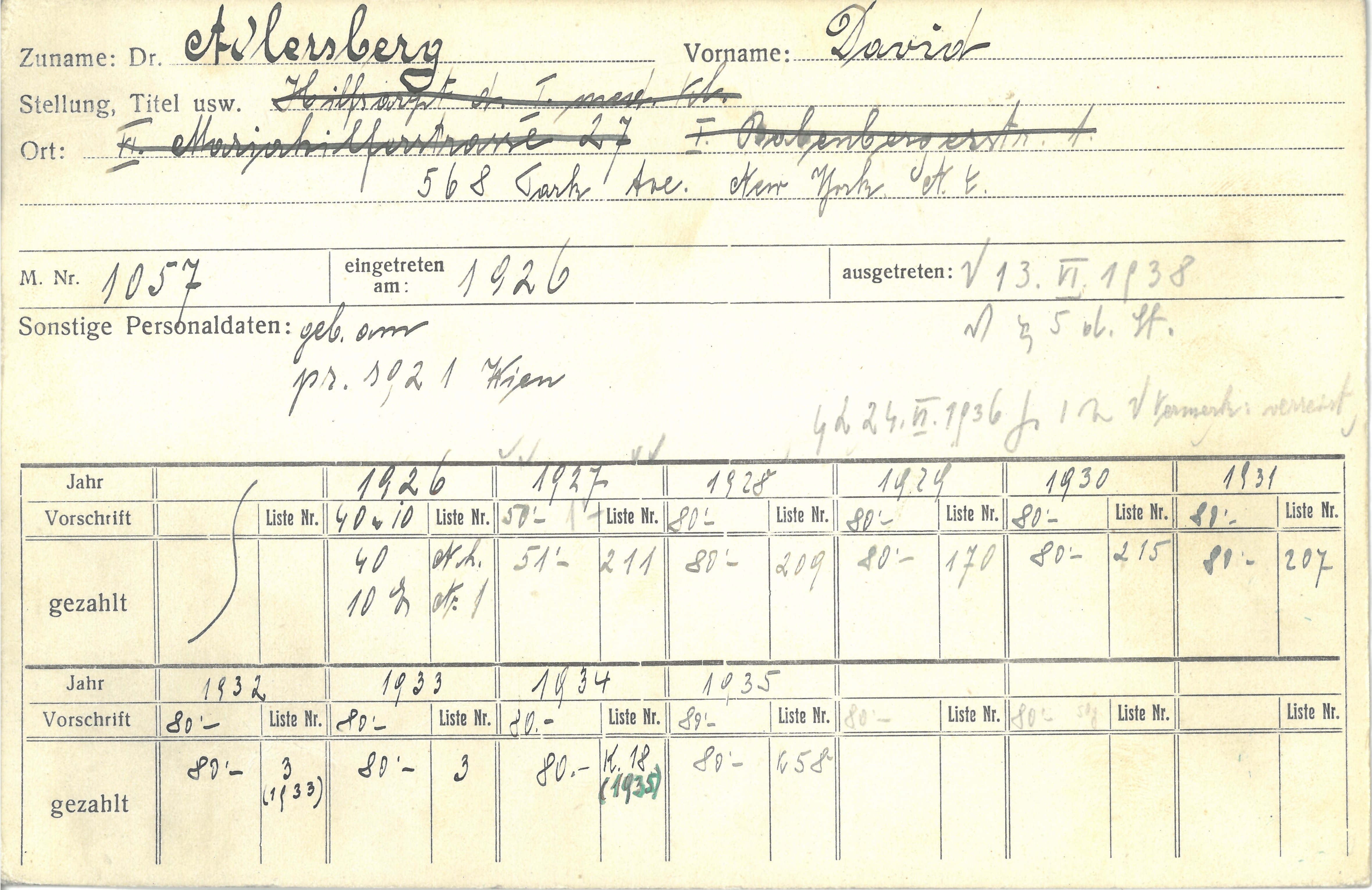 David Adlersberg war bis 1936 an der I. Medizinischen Klinik des Wiener AKH als Internist tätig, zuletzt unter Hans Eppinger jun. (1879–1946). Nach Forschungsaufenthalten in den USA emigrierte er am 22. April 1936 mit seiner Familie über Le Havre mit der SS Champlain nach New York. Grund hierfür war die Annäherung Eppingers an den Nationalsozialismus. Noch Anfang April 1936 hielt er in der Gesellschaft der Ärzte in Wien den Vortrag „Ein neues Insulin“. Er hatte die Position eines Clinical Professor of Medicine an der Columbia University inne.