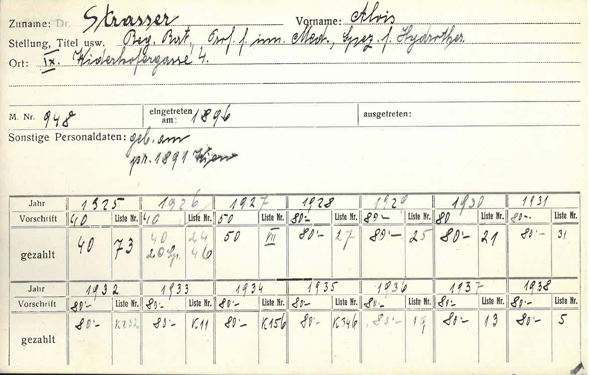 galt, war Alois Strasser vor Deportation geschützt. Er arbeitete als „Fachkrankenbehandler für Juden“ und starb Anfang April 1945 im Jüdischen Spital in der Malzgasse.