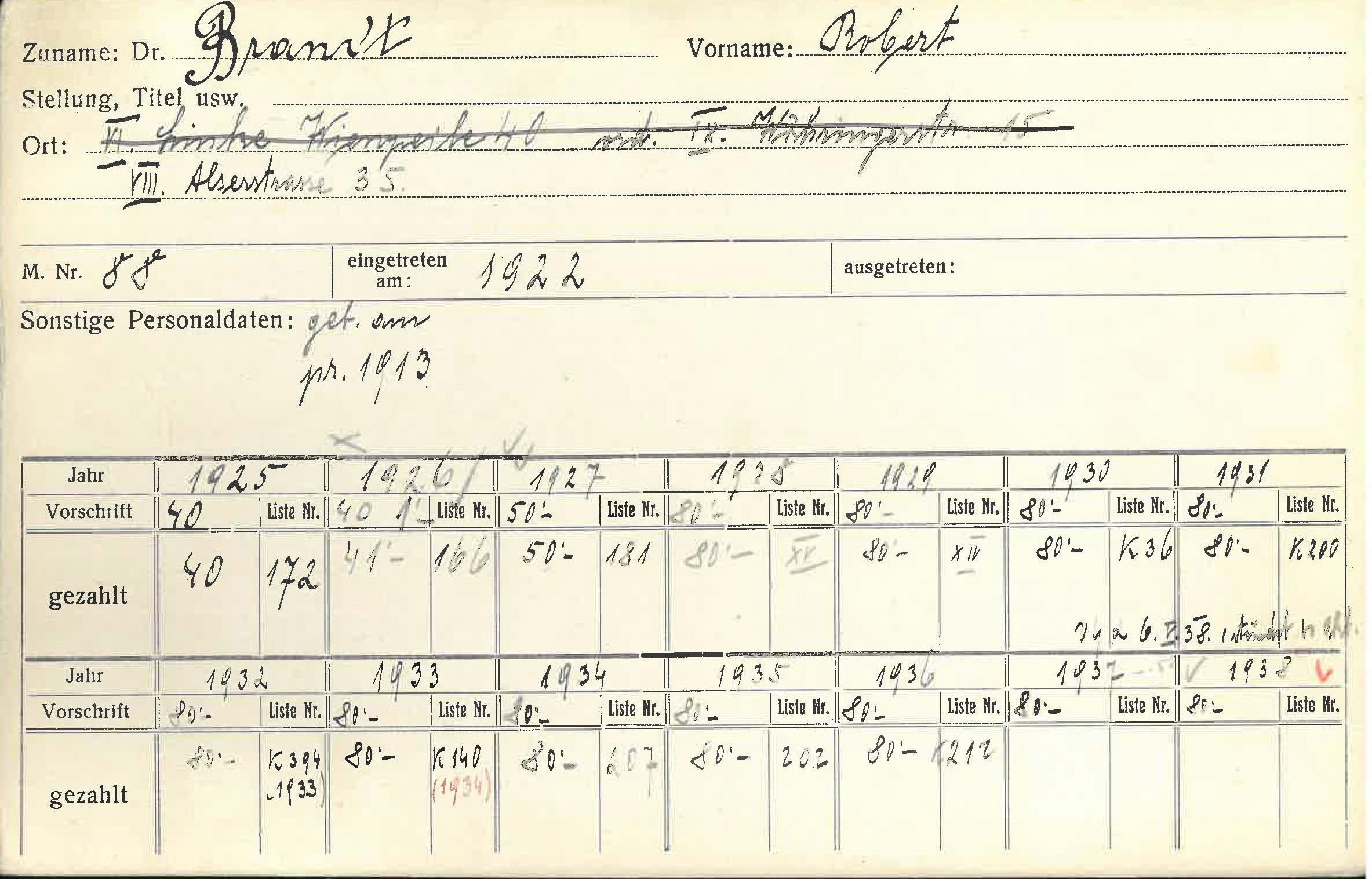 Robert Brandt (1888-1963) war am Ersten Öffentlichen Kinder-Krankeninstitut in der Abteilung für Hautkrankheiten beschäftigt. 1938 gelang ihm die Flucht in die USA, wo er an der University of Cincinnati College of Medicine in Ohio eine Anstellung fand. Brandt