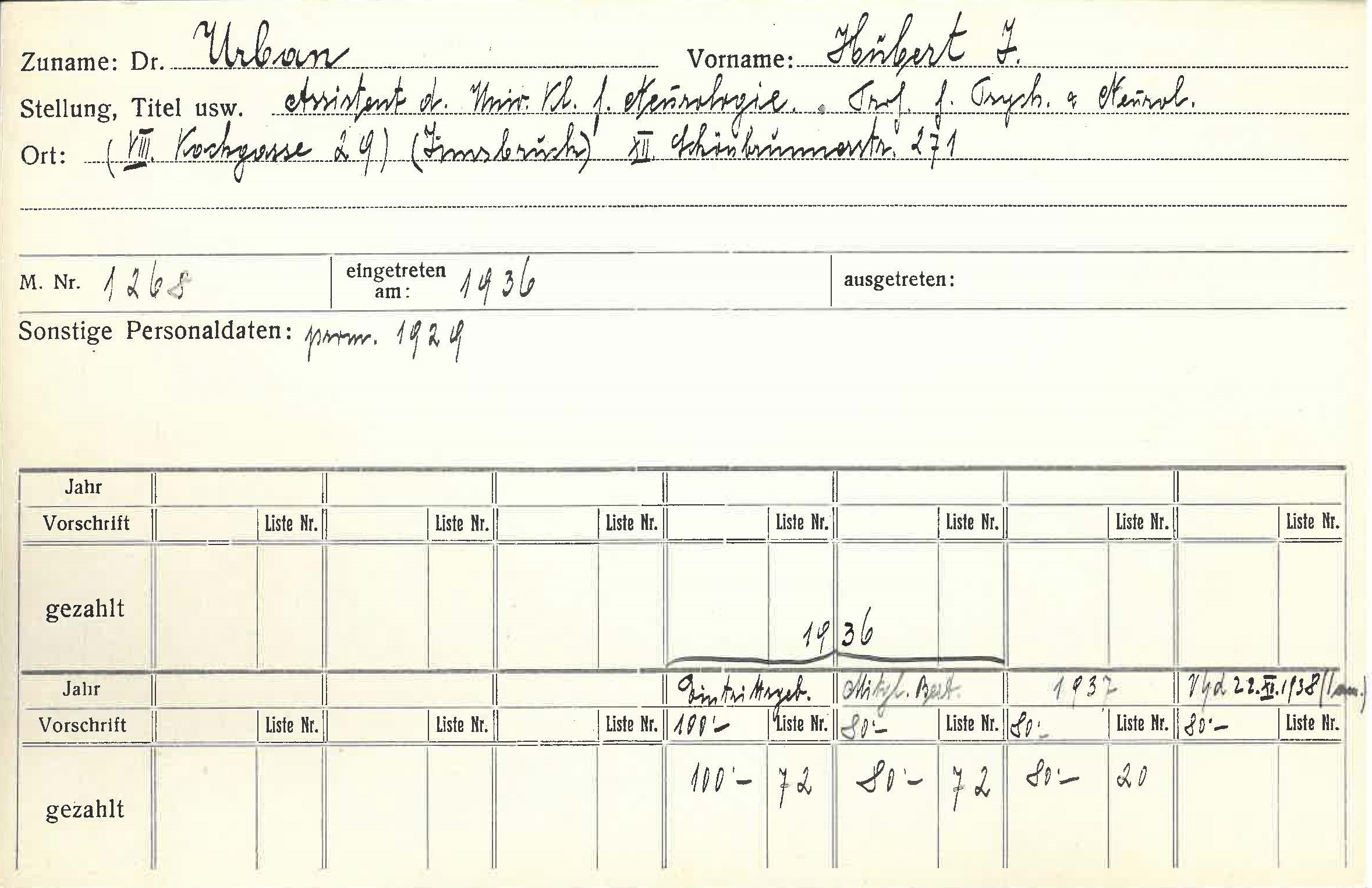 Hubert J. Urban wurde im Jänner 19938 zum ao. Prof. für Neurologie an die Univ. Innsbruck berufen, aber nach dem „Anschluss“ seines Postens enthoben. Er eröffnete daraufhin in Wien eine Privatpraxis und wurde mit Ausbruch des 2. Weltkrieges einberufen. Nach 1945 kehrte er nach Innsbruck zurück, wo er am 10. Juli 1946 zum Universitätsprofessor ernannt wurde.