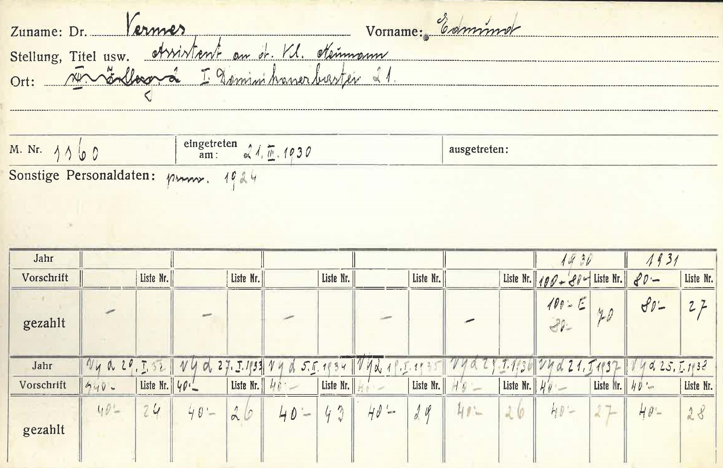 Edmund Vermes gelang nach dem "Anschluss" im Juni 1938 die Flucht nach Frankreich. Von dort flüchtete er 1942 weiter nach Spanien. Im September 1943 gelang ihm von Lissabon aus die Emigration in die USA.