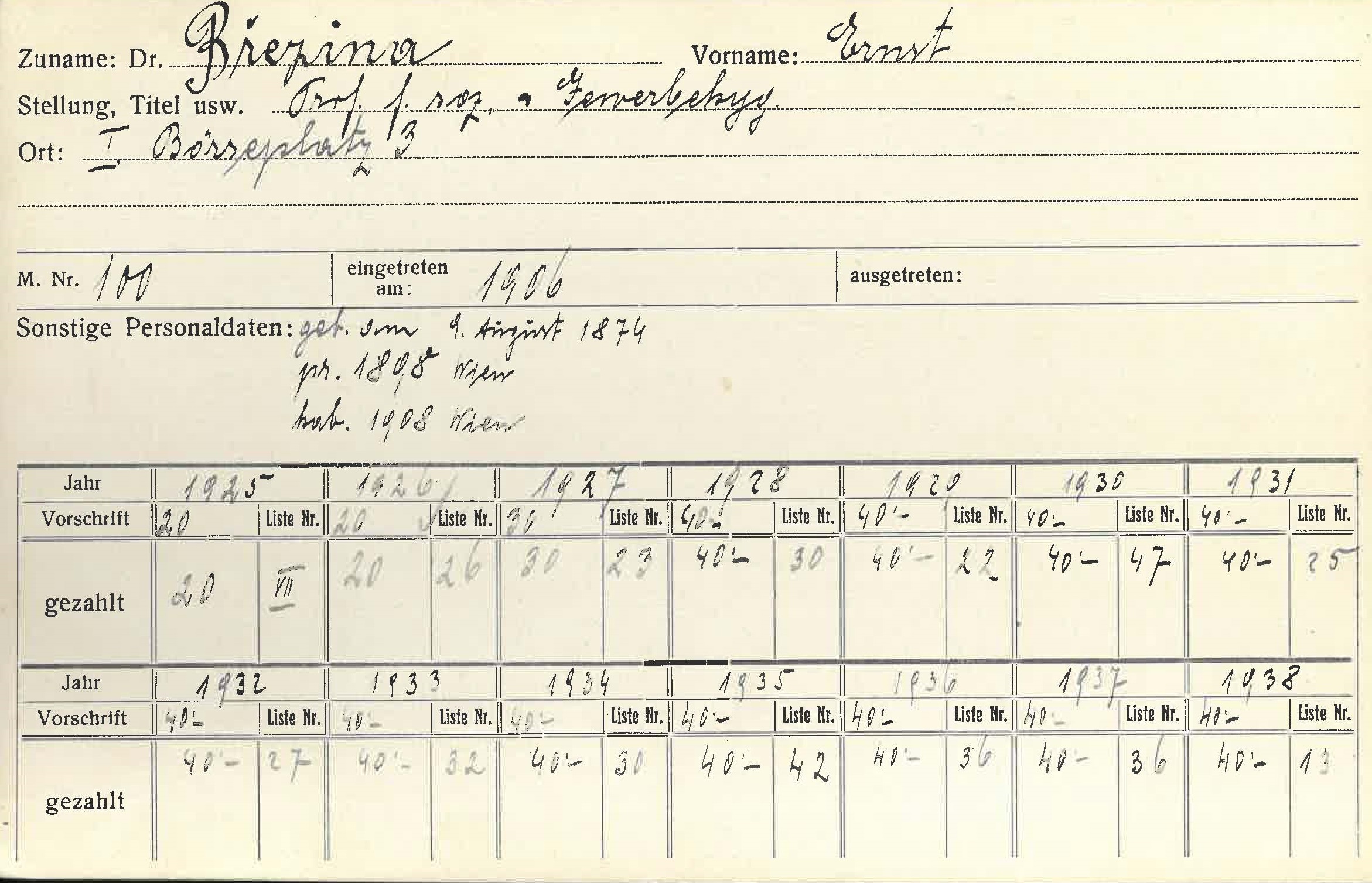 Ernst Brezina war Teil eines vom Verwaltungsrates der Gesellschaft der Ärzte in Wien 1909 eingesetzten Komitees. Auf Antrag Ludwig Telekys war dieses Komitee mit der Ausarbeitung eines Memorandums "Bezüglich der Einschränkung der Arbeitszeit bei besonders gesundheitsgefährlichen Arbeitsverrichtungen" beschäftigt, welches an die zuständigen Behörden weitergeleitet wurde. Außerdem hielt Brezina folgenden Vortrag in der Gesellschaft der Ärzte: Körpermessungen bei Arbeitern (25. 6. 1926).