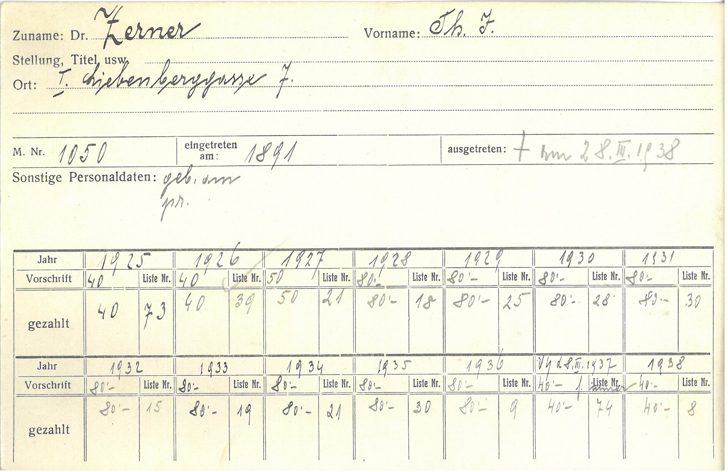 im Holocaust ermordet, am 30.03.1938 in Wien gestorben. Zerner stirbt am 30.3.1938 nur zwei Tage nachdem er aus der Gesellschaft der Ärzte in Wien ausgetreten war.