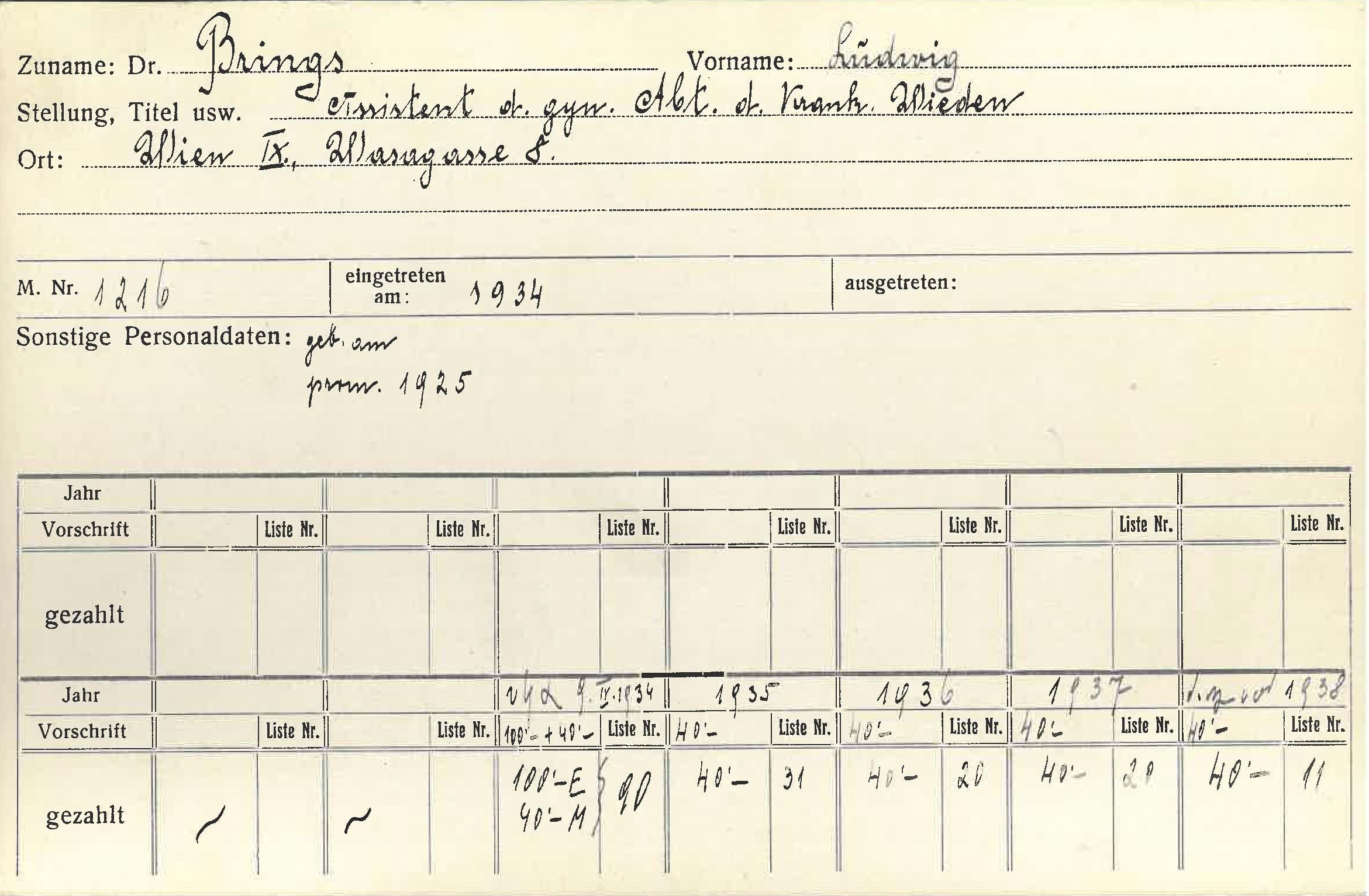 Ludwig Brings hielt folgende Vorträge in der Gesellschaft der Ärzte in Wien: Missbildungen von Aplasia cutis (18.1.1935), Ovarientransplantation in die Vorderkammer der Kaninchen (30.11.1934). Text: Josef Hlade nach Isidor Fischer.