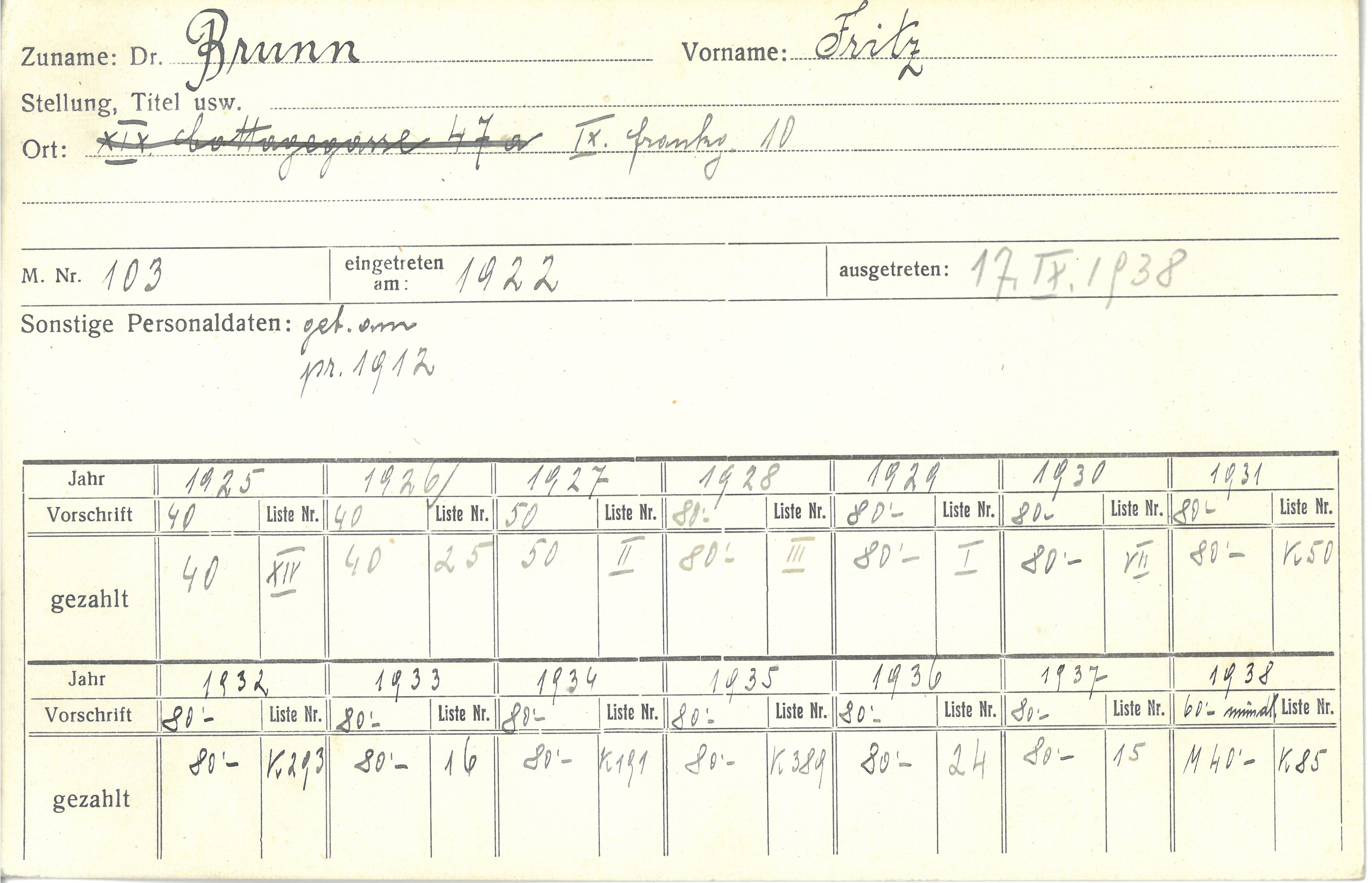 Fritz Brunn wurde am 1 Juni 1888 in Wien geboren und starb am 14. Dezember 1973 im Alter von 85 Jahren in der Schweiz (Lugano, Ticino). Er hielt folgende Vorträge in der Gesellschaft der Ärzte in Wien: Über die Wirkung des Akineton (26. 1. 1923), Eine akute Thalliumvergiftung (20. 5. 1927), Ruptur des Septum ventriculorum cordis (10. 11. 1922 und 23. 3. 1923), Gonorrhoische Hemiplegie (31. 3. 1922), (mit F. Mandl) Bekämpfung viszeraler Schmerzen mittels paravertebraler Injektion (11. 4. 1924)