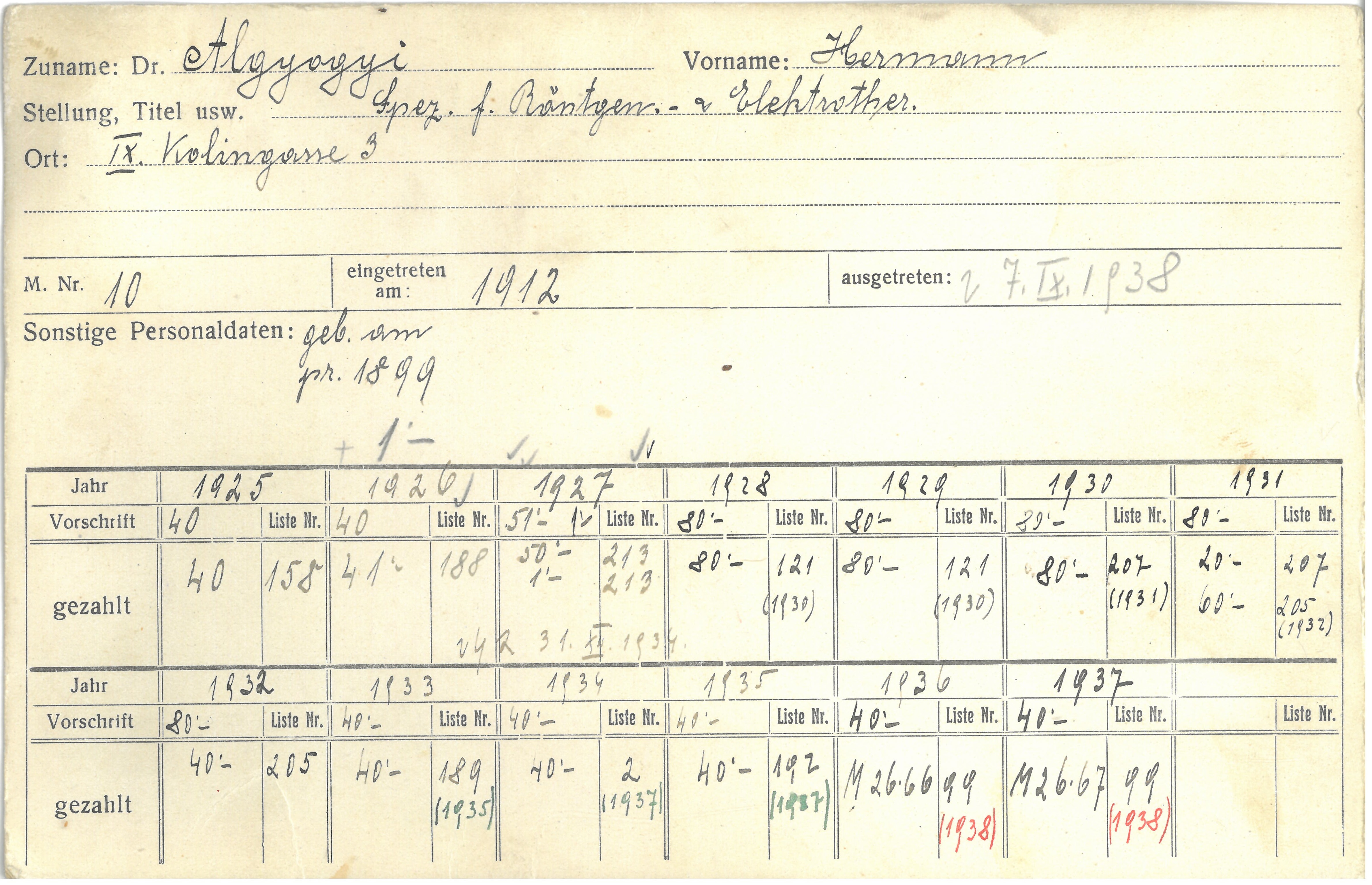 Hermann Algyogyi zählte zu den Pionieren der Radiologie in Wien. Ab 1901 arbeitete er in der Abteilung von Moriz Benedikt (1835-1920) an der Wiener Poliklinik. Seine Ausbildung absolvierte er an der Röntgenabteilung des AKH unter der Leitung von Robert Kienböck (1871-1953), wo er 1909 Assistent wurde. Im Jahr 1910 wurde er zum Leiter des Röntgeninstituts des Krankenhauses der Barmherzigen Brüder ernannt. Als Jude verfolgt, starb er aus unbekannten Gründen kurz vor Kriegsende, am 29. 3. 1945, in Wien.