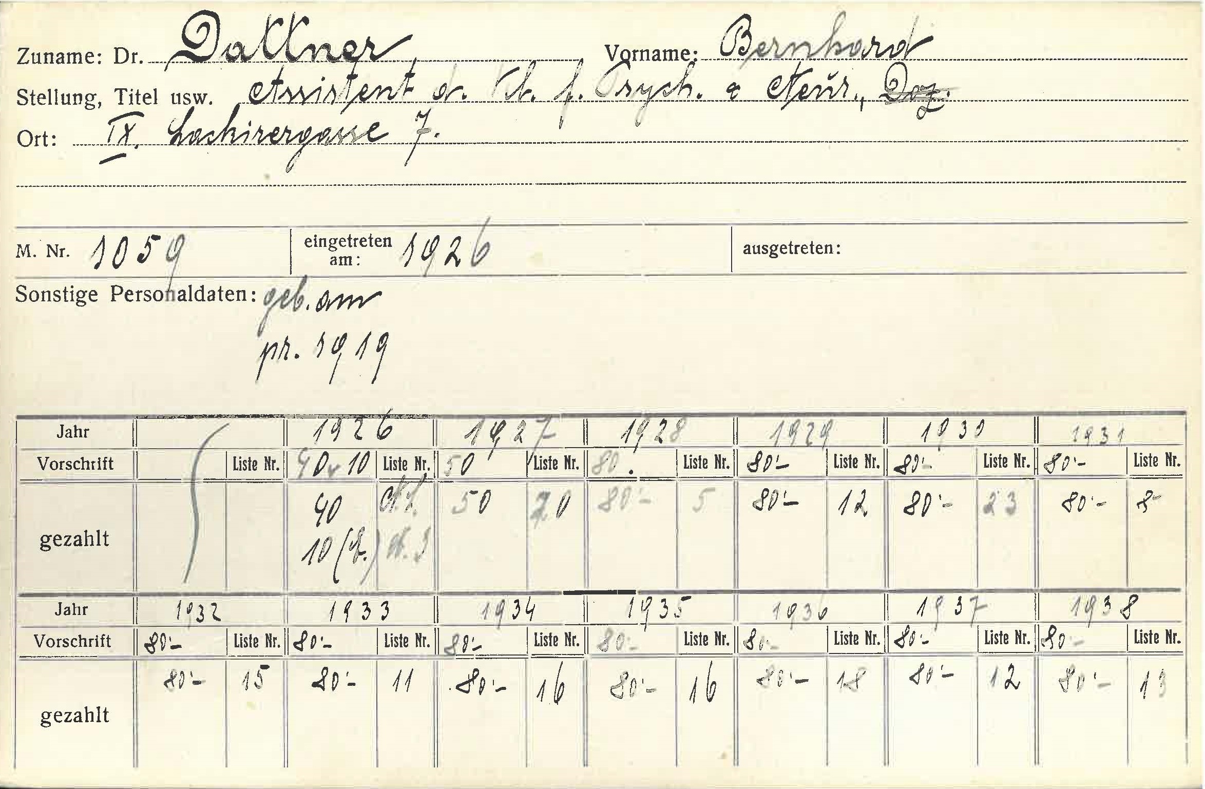 Dattner hielt folgende Vorträge in der Gesellschaft der Ärzte in Wien: (mit H. Urban) Über Fälle von Cushingschem Syndrom (31.5.1935 bzw. 23.10.1936), (mit Constantin von Economo)