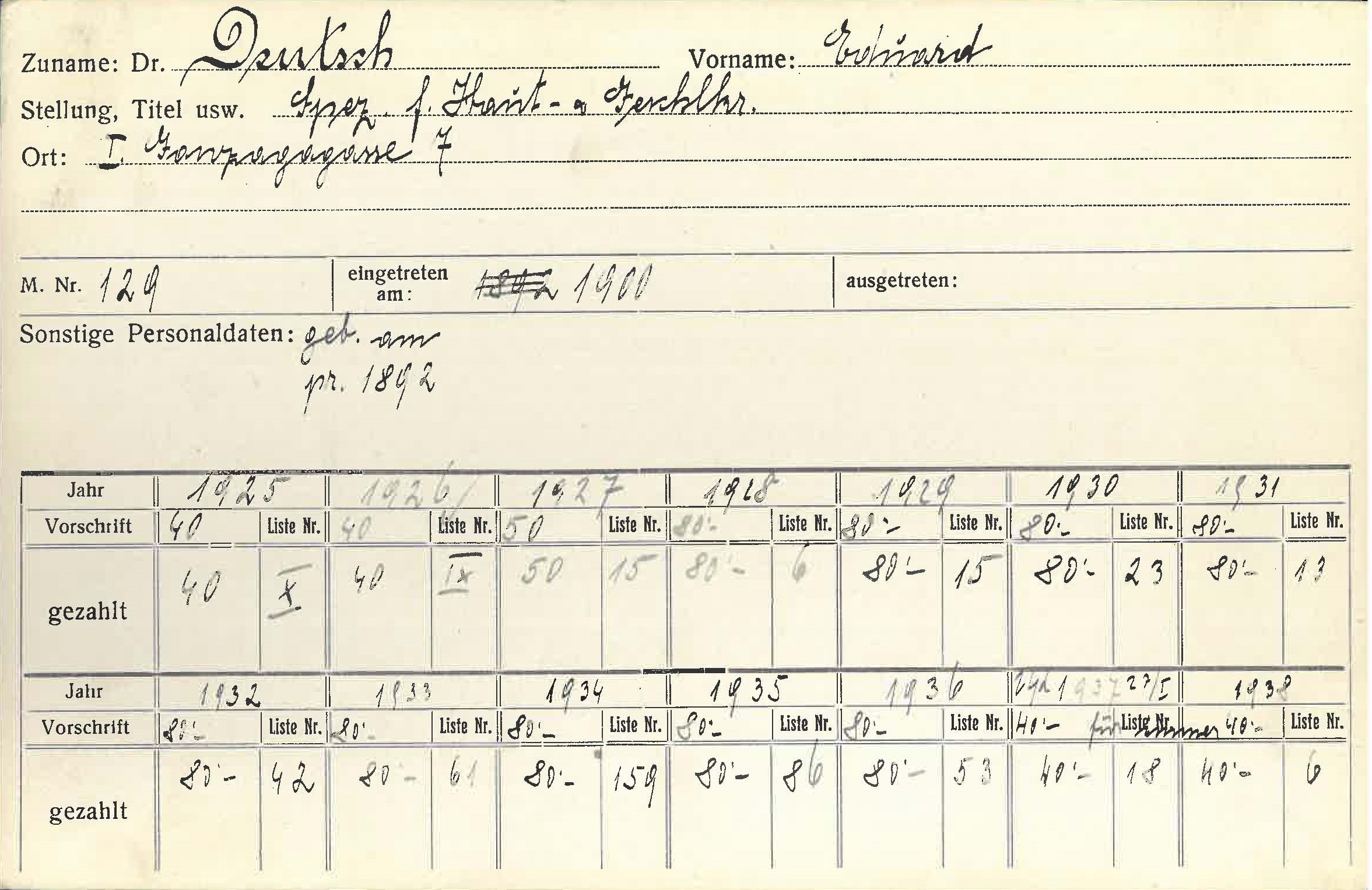 Deutsch hielt nach Isidor Fischer keine Vorträge in der Gesellschaft der Ärzte in Wien.