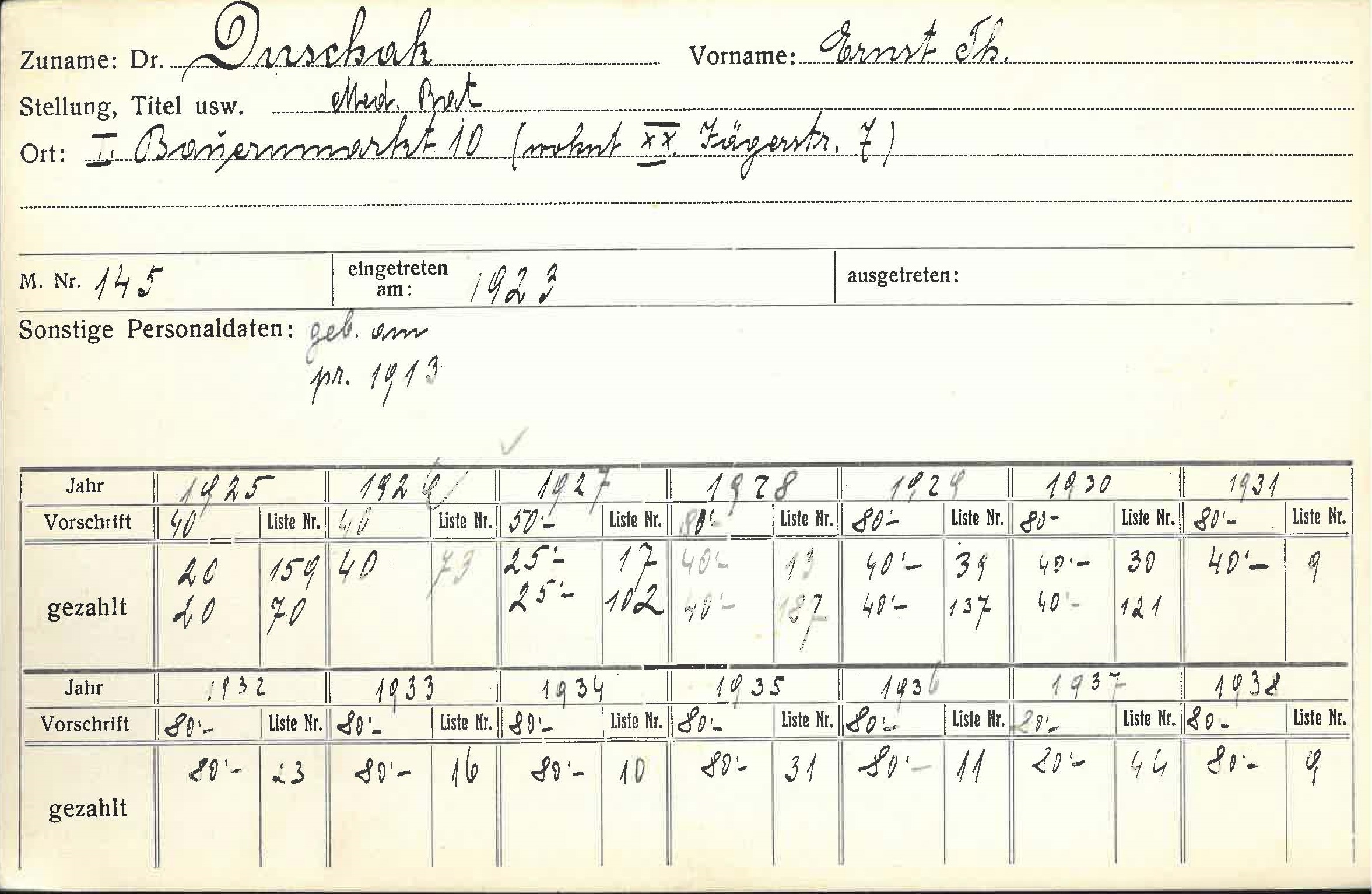 Ernst Theodor Duschak (1890-1970). Er war Kassaverwalter und Leiter der Orthopädischen Abteilung des Ersten Öffentlichen Kinder-Krankeninstitutes in Wien und Mitglied der „Vereinigung der Orthopäden Wiens“. Ihm gelang die Flucht in die USA, wo er 1970 in New York verstarb.