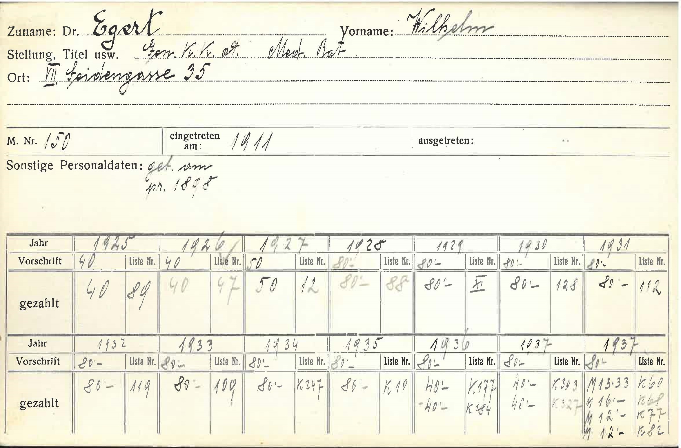 Egert stirbt am 7.6.1944 in Wien unter ungeklärten Umständen. Egert hielt nach Isidor Fischer keine Vorträge in der Gesellschaft der Ärzte in Wien.